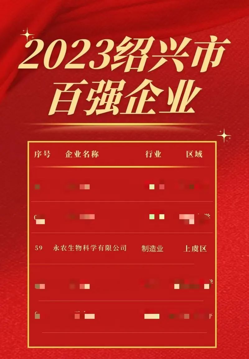 近日,“2023绍兴市百强企业”榜单出炉,永农生物科学有限公司实力上榜,位居第59位!