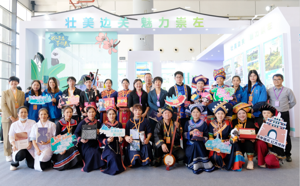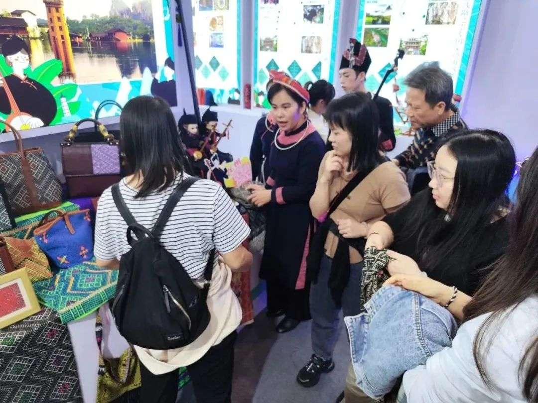 在崇左展区,龙州展台的壮锦围巾、壮锦手提包、壮锦抽绳炭包、壮锦挂件等特色非遗产品,深受市民游客喜爱。精美的壮锦和充满壮韵壮味的天琴表演吸引市民游客驻足围观,纷纷打卡拍照。崇左展区不仅向市民游客展示各县的非遗精品,还设有“崇左国家海边风景道探秘之旅”、“美食尊享之旅”、“非遗文化传承之旅”、“崇左+越南跨境之旅”、“红情绿意山水文化之旅”等精品旅游路线,吸引大批市民游客驻足询问。