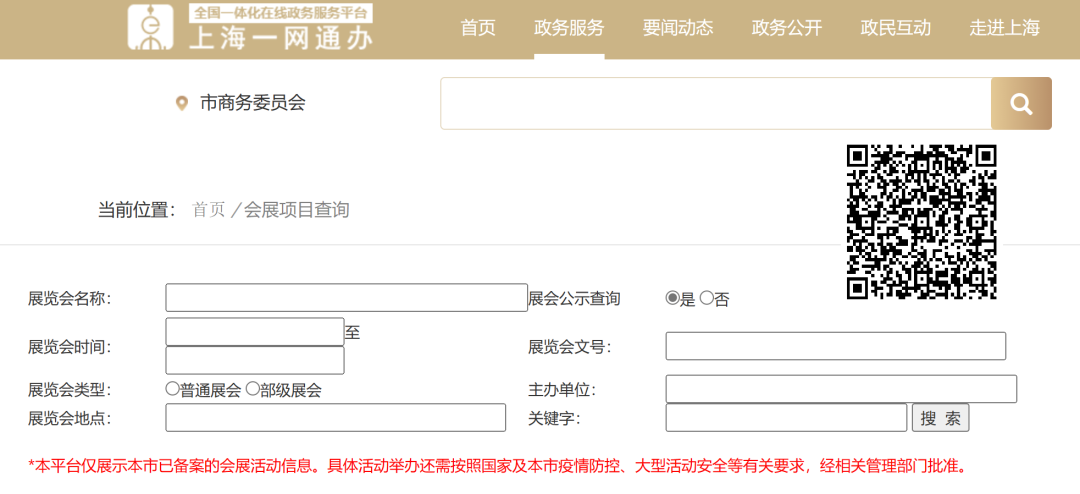 在上海举办的展会可登录“上海市会展业公共信息服务平台”查询,网址:https://expo.sww.sh.gov.cn/browser/search-entp-index.jspx?code=SEARCH或者识别下图的二维码