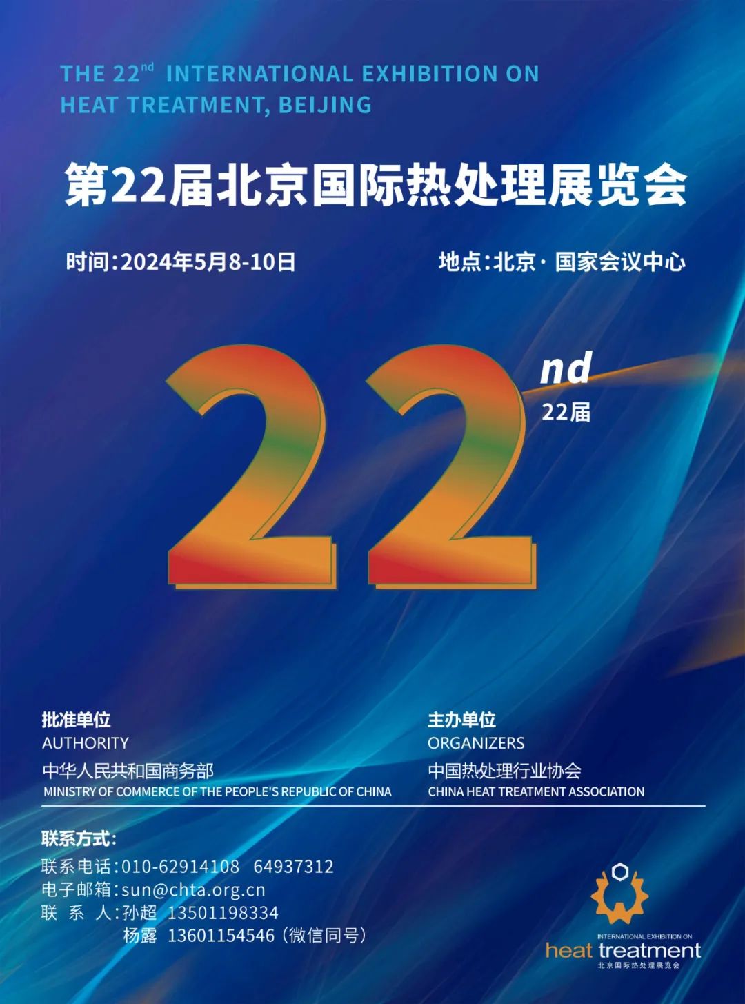 定档2024年5月8-10日召开的“第22届北京国际热处理展览会”为中国热协主办的唯一国际热处理专业展会,同期还将举办多场重磅活动。