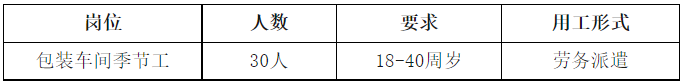 根据工作需要,受河北衡水老白干酒业股份有限公司委托,衡水市博元人力资源有限公司现面向社会公开招聘包装车间劳务派遣季节工,现将具体招聘事宜公告如下。