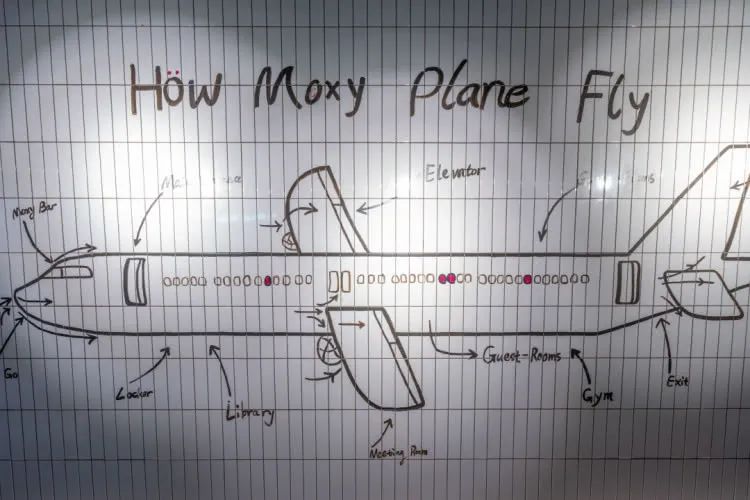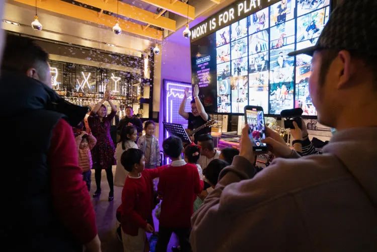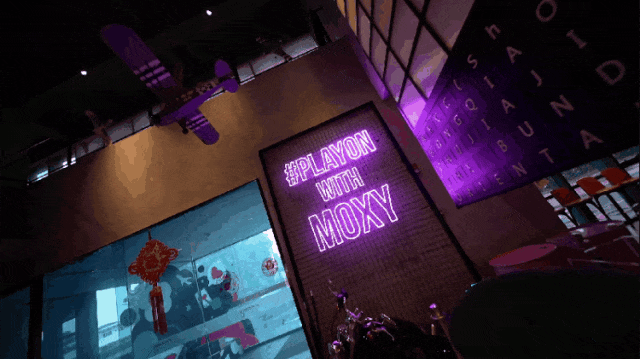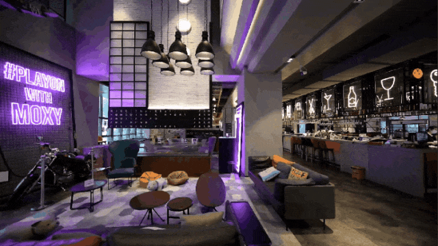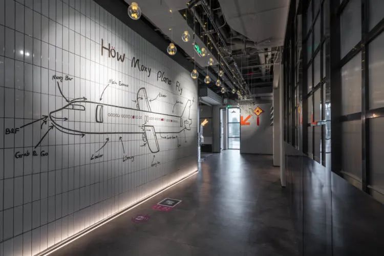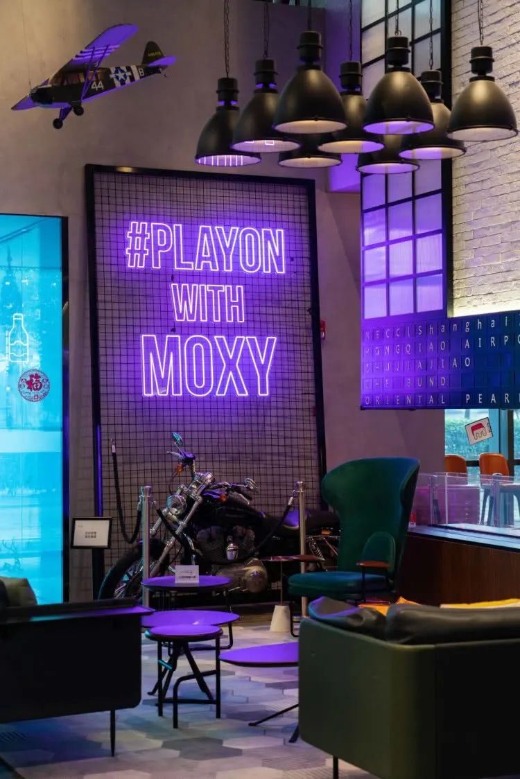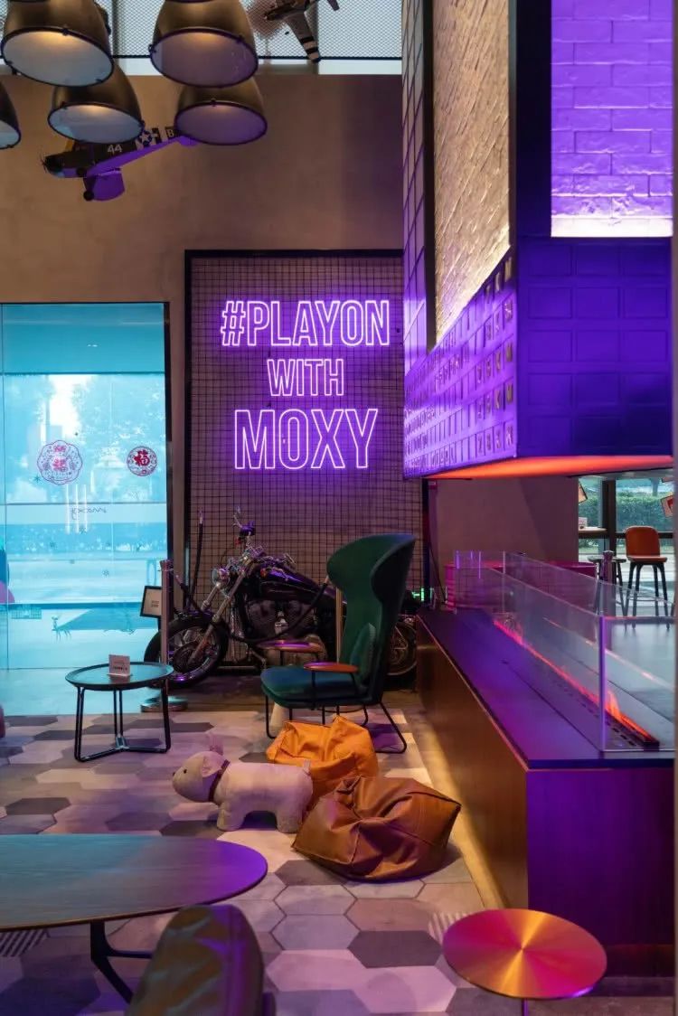 除此之外,机车、飞机元素贯穿酒店内外,让人意想不到的是办理入住的地方竟然是在吧台,这个吧台位于酒店大堂中央地带,所以入住客人也很好找,Moxy的潮玩之旅也是从此处开启。