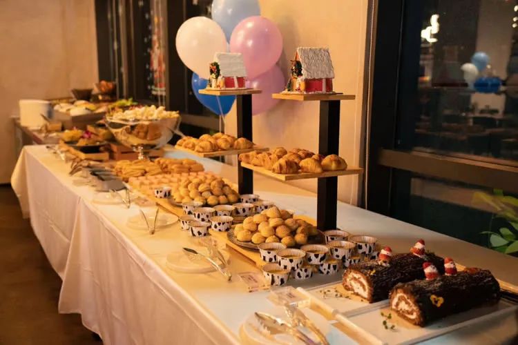迷你可颂、树根蛋糕、奶油泡芙、圣诞主题甜点、焦糖布丁、慕斯蛋糕、糖画+棉花糖