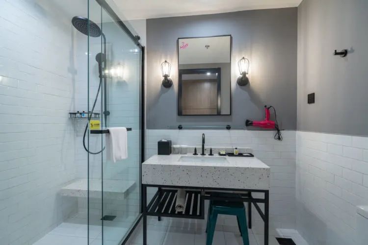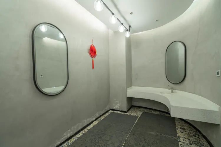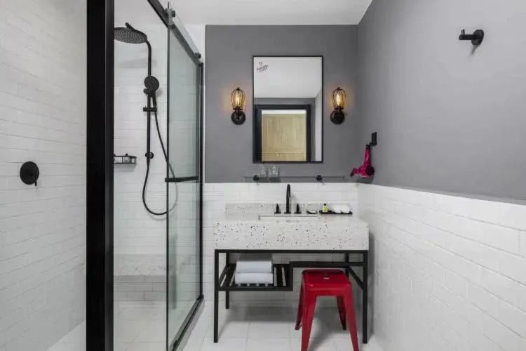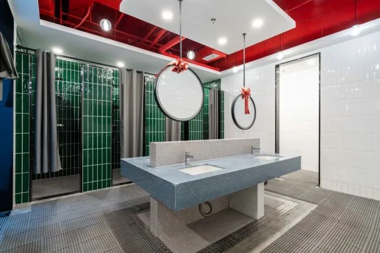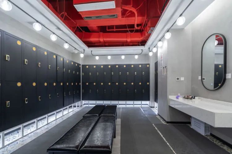 在游泳池里放肆畅游结束,还有干净整洁的更衣室可用来冲洗,同样工业风的设计风格,颜色搭配的恰到好处,观感让人觉得赏心悦目。