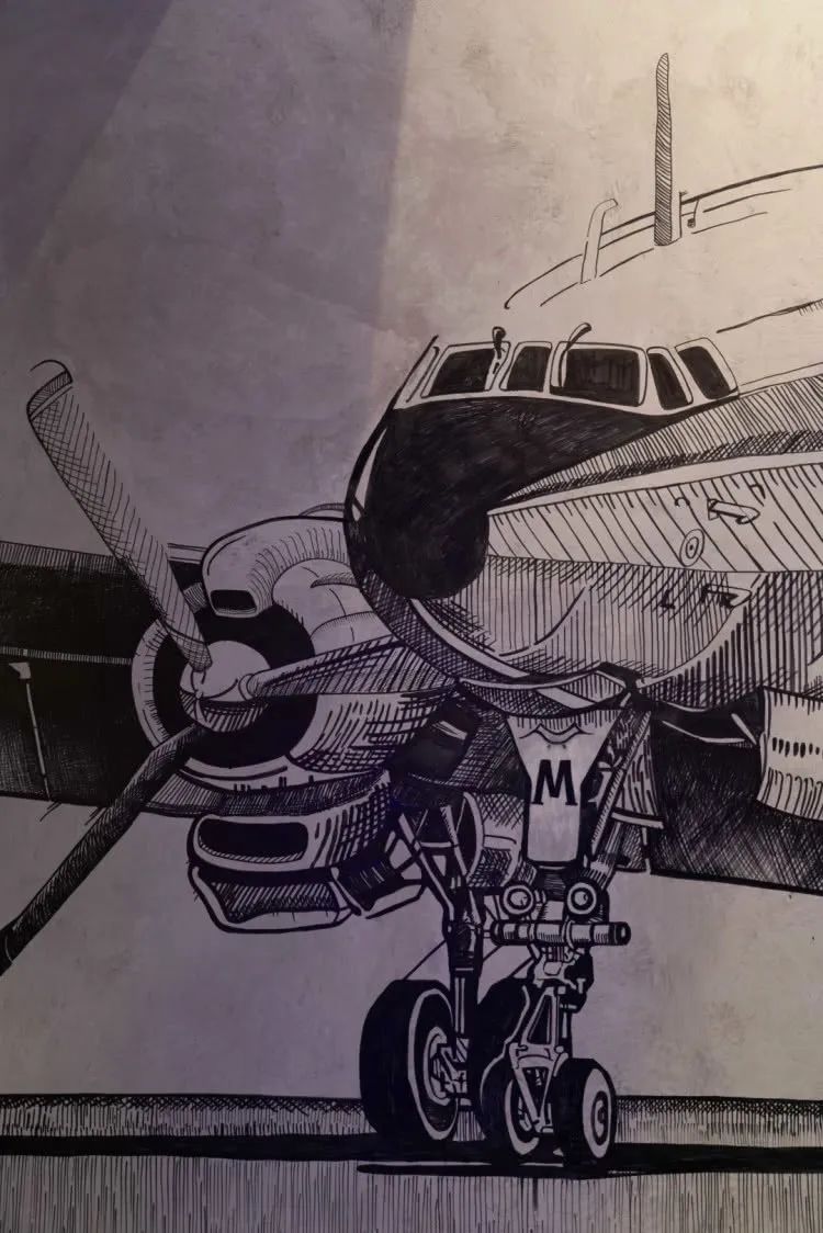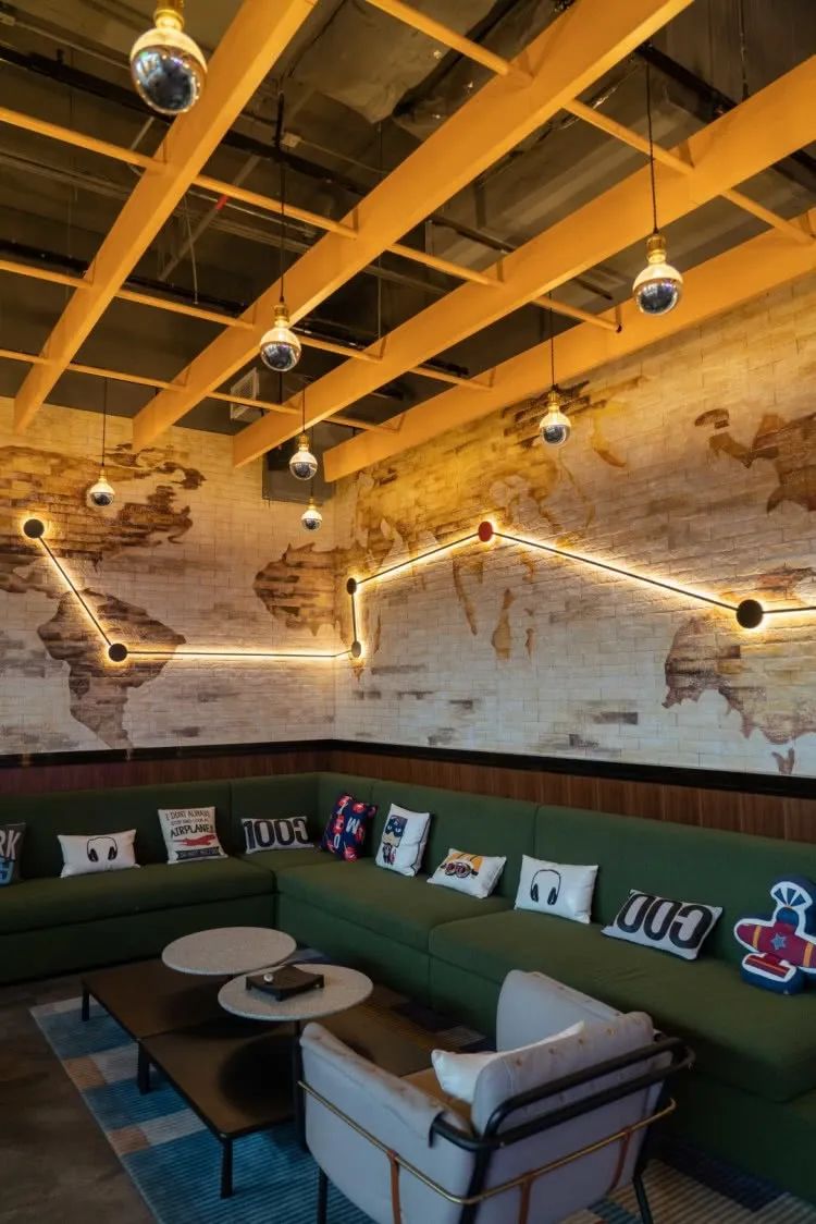 如抱枕、墙壁上的飞机航线、飞机模型画等都是以上海虹桥国际枢纽为灵感所布置,装修风格以经典的工业风,让人宛若闯进了赛博朋克!