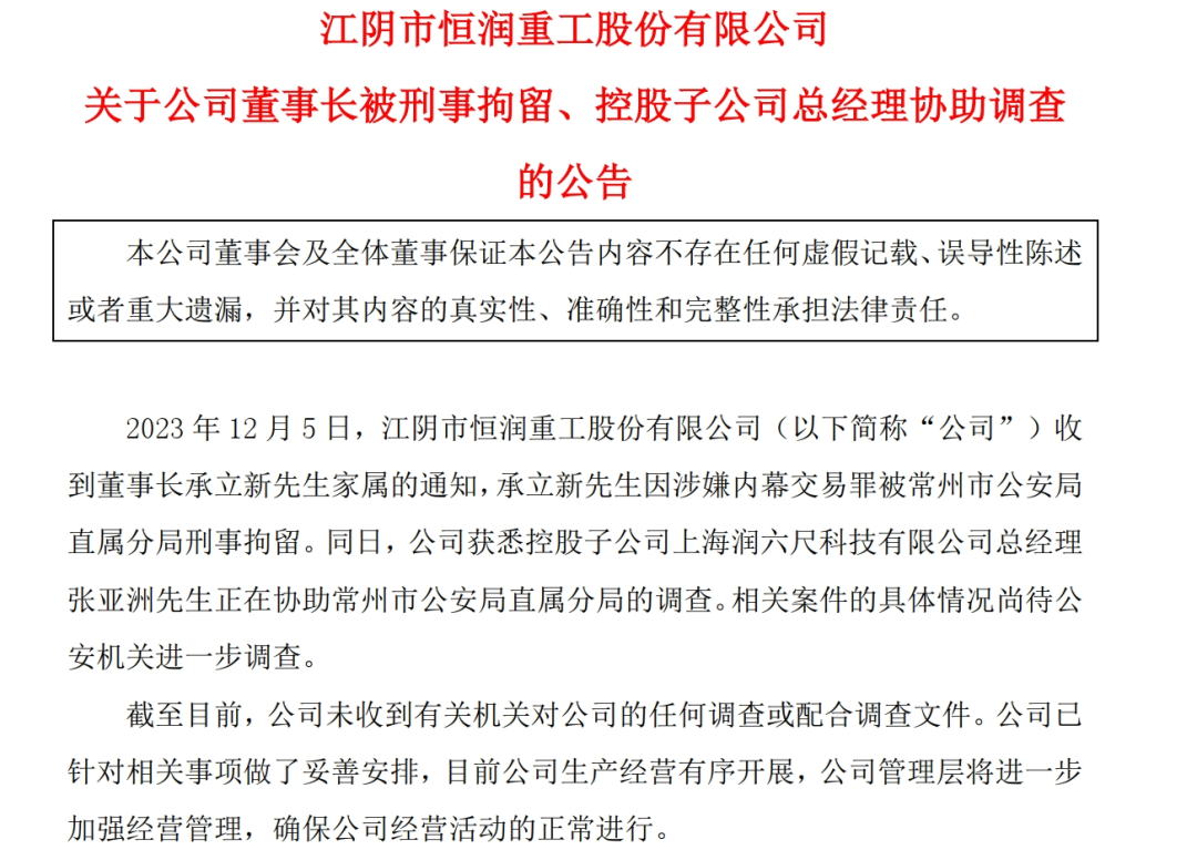 12月5日晚间,算力概念大牛股恒润股份公告称,公司董事长承立新因涉嫌内幕交易罪被常州市公安局直属分局刑事拘留。同日,公司控股子公司上海润六尺科技有限公司总经理张亚洲正在协助常州市公安局直属分局的调查。