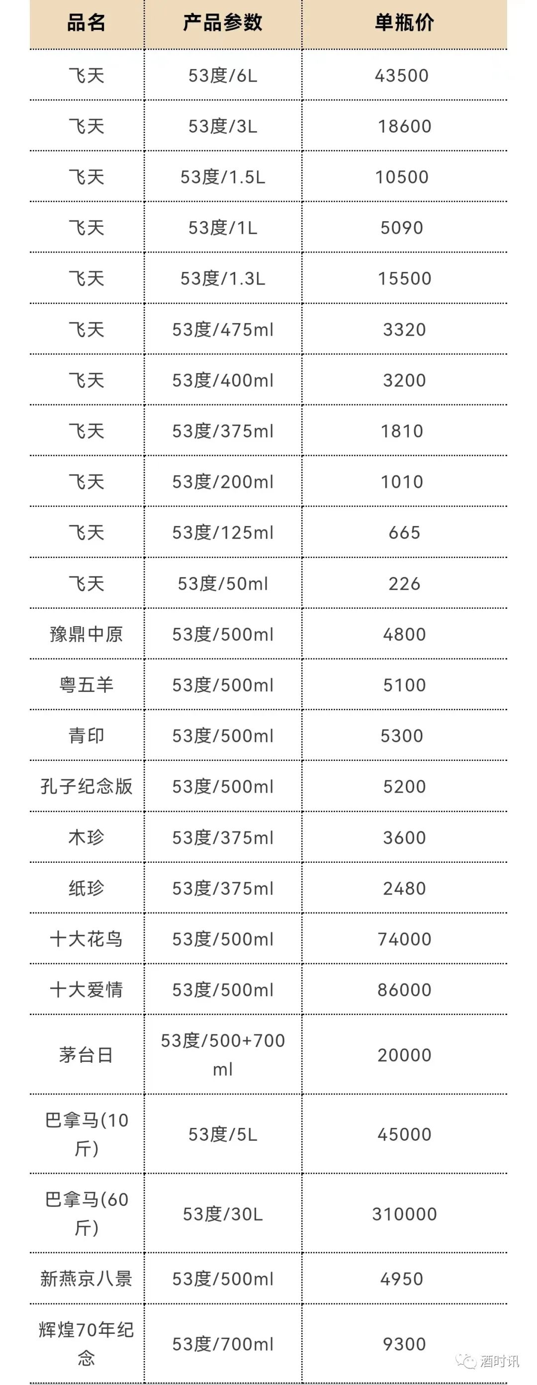 0 珍5 53%VOL 500ML 135 135 0 珍酒尊藏 53%VOL 500ML 255 255 0 老珍酒 53%VOL 500ML 80 80 0 古井贡系列 规格 12.5 12.6 涨幅 古20 52%VOL 500ML 500 500 0 古16 52%VOL 500ML 320 320 0 古8 50%VOL 500ML 225 225 0 古5 50%VOL 500ML 103 103 0 幸福版 50%VOL 500ML 76 76 0 安酒系列 规格 12.5 12.6 涨幅 经典 53%VOL 500ML 650 650 0 臻藏 46+70%VOL 500ML 410 410 0 恒昌烧坊 规格 12.5 12.6 涨幅 1经典 53%VOL 500ML 390 390 0 西凤系列 规格 12.5 12.6 涨幅 红西凤 55%VOL 500ML 725 725 0 酒海陈藏(10年) 52%VOL 500ML 150 150 0 酒海陈藏(5年) 42%VOL 500ML 78 78 0 华山论剑10 52%VOL 500ML 130 130 0 华山论剑20 52%VOL 500ML 255 255 0 华山论剑30 55%VOL 500ML 380 380 0 华山论剑50 52%VOL 500ML 480 480 0 老绿玻瓶 55%VOL 500ML 40 40 0 怀庄 规格 12.5 12.6 涨幅 怀庄聖品 53%VOL 500ML 150 150 0 怀庄大曲 53%VOL 500ML 160 160 0 丹泉系列 规格 12.5 12.6 涨幅 丹泉10 50%VOL 500ML 150 150 0 丹泉15 53%VOL 500ML 400 400 0 丹泉20 53%VOL 500ML 510 510 0 丹泉30 53%VOL 500ML 835 835 0 双沟系列 规格 12.5 12.6 涨幅 圣坊 46%VOL 500ML 150 150 0 君坊 52%VOL 500ML 85 85 0 双沟大曲 53%VOL 500ML 12 12 0 口子窖系列 规格 12.5 12.6 涨幅 30年型 52%VOL 500ML 720 720 0 20年型 41%VOL 500ML 320 320 0 10年型 41%VOL 500ML 215 215 0 6年型 41%VOL 500ML 100 100 0 潭酒系列 规格 12.5 12.6 涨幅 紫潭 53%VOL 500ML 390 390 0 红得发紫 53%VOL 500ML 275 275 0 红潭 53%VOL 500ML 190 190 0 金酱 53%VOL 500ML 125 125 0 银酱 53%VOL 500ML 90 90 0 杜康系列 规格 12.5 12.6 涨幅 小封坛(青坛) 46%VOL 500ML 310 310 0 小封坛(玉坛) 52%VOL 500ML 620 620 0 12窖区(新) 52%VOL 500ML 175 175 0 9窖区(新) 50%VOL 500ML 105 105 0 6窖区(新) 50%VOL 500ML 70 70 0 白云边系列 规格 12.5 12.6 涨幅 20年陈酿 53%VOL 500ML 410 410 0 15年陈酿 42%VOL 500ML 140 140 0 12年陈酿 42%VOL 500ML 100 100 0 5星 53%VOL 500ML 80 80 0 4星 53%VOL 500ML 50 50 0 3星 53%VOL 500ML 36 36 0 个性茅台系列参考价格