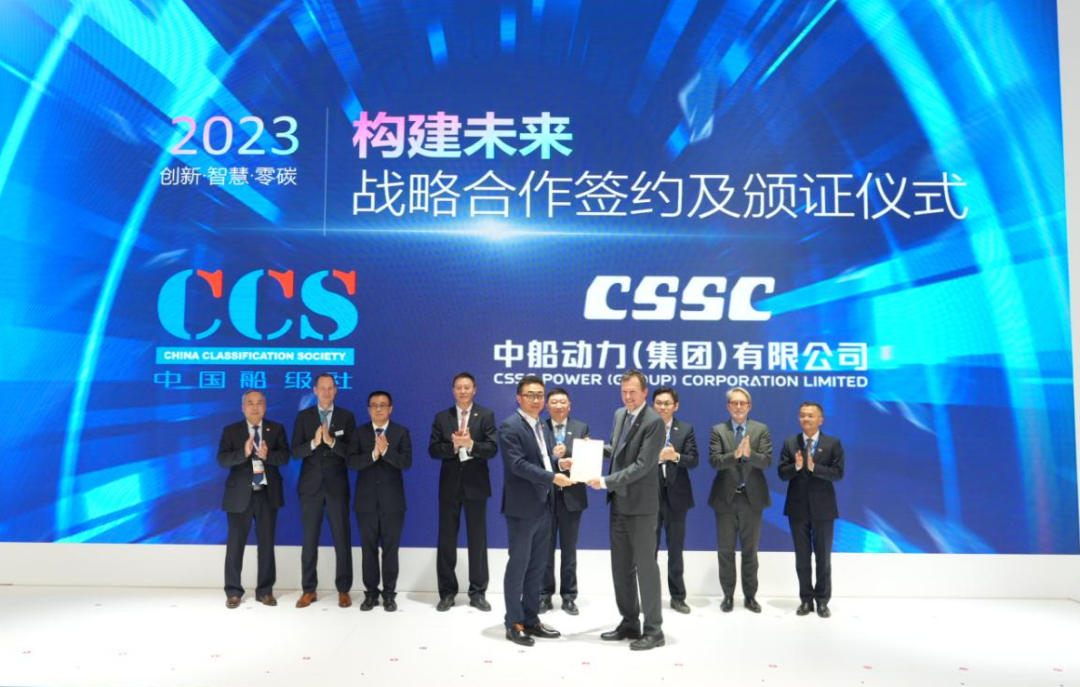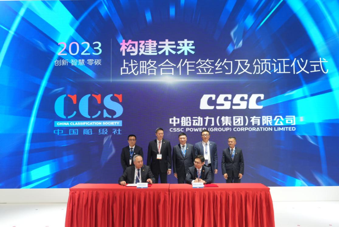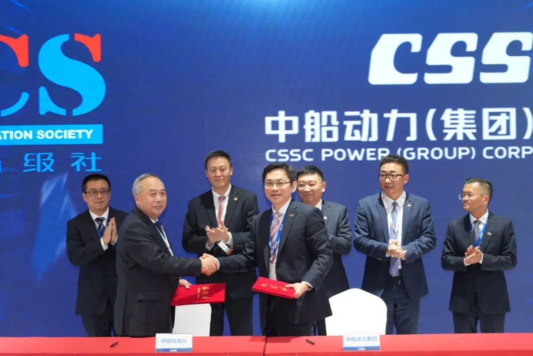 当天下午,中船动力集团与CCS中国船级社举行战略合作签约及授证仪式。CCS中国船级社副总裁赵晏、产品处处长姜波涛,中船动力集团党委书记、董事长李琤、党委副书记、总经理邵煜等领导出席仪式。