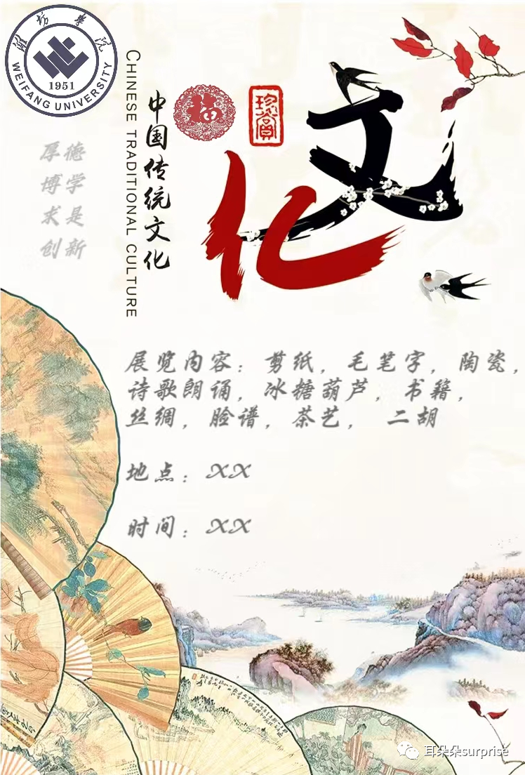 本次展览活动由手工剪纸、毛笔字、陶瓷、诗词、冰糖葫芦、丝绸、茶艺、二胡演奏、脸谱、汉服走秀十个模块组成。鲜明的呈现:服饰礼仪之美、诗词歌赋之韵、茶道之不朽、书法之自然。