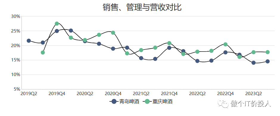 4、两家公司的管理和销售费用之和,共同之处都在Q4季度占比最高。重庆啤酒从年初到年末,四个季度逐级提升。除此之外,青岛啤酒一季度是高于二三季度,我想这跟所处地域有一定关系。(观点仅供参考)