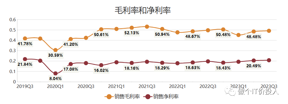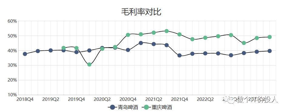 2、由于我这边摘录的数据是从2019年底开始,从2020年Q4后,重庆啤酒的毛利率显著高于青岛啤酒,两者相差了将近9-10个百分点。近3年,青岛啤酒的毛利率高于以往。此外,净利率多个季度保持稳定,相当丝滑。