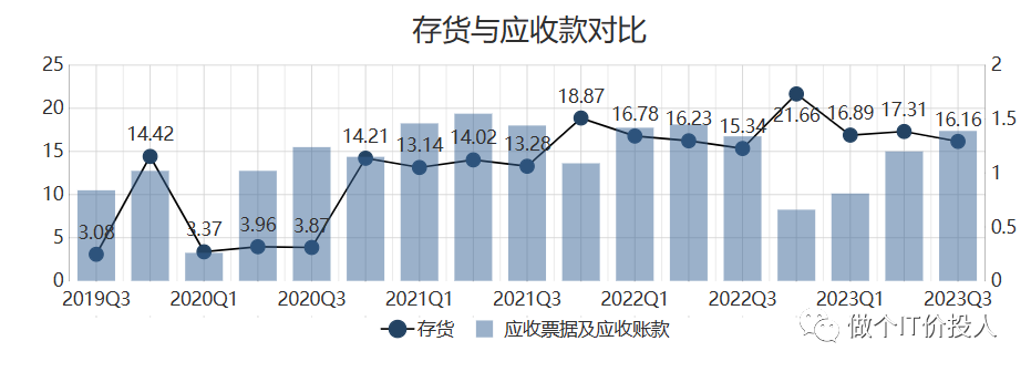 5、应收款在2022年Q4出现大幅下降的情况下,从2023年公司的应收款呈现一个明显上升趋势。与青岛啤酒一样,账龄结构还是健康,绝大多数应收款都在一年期内。与同期相比,应收款也只是同比增长了3.73%,存货三季度同比增长5.35%,都是低于营收增速。与青岛啤酒一样,存货分类中包装物占比最大,相对来说变化也是最大。