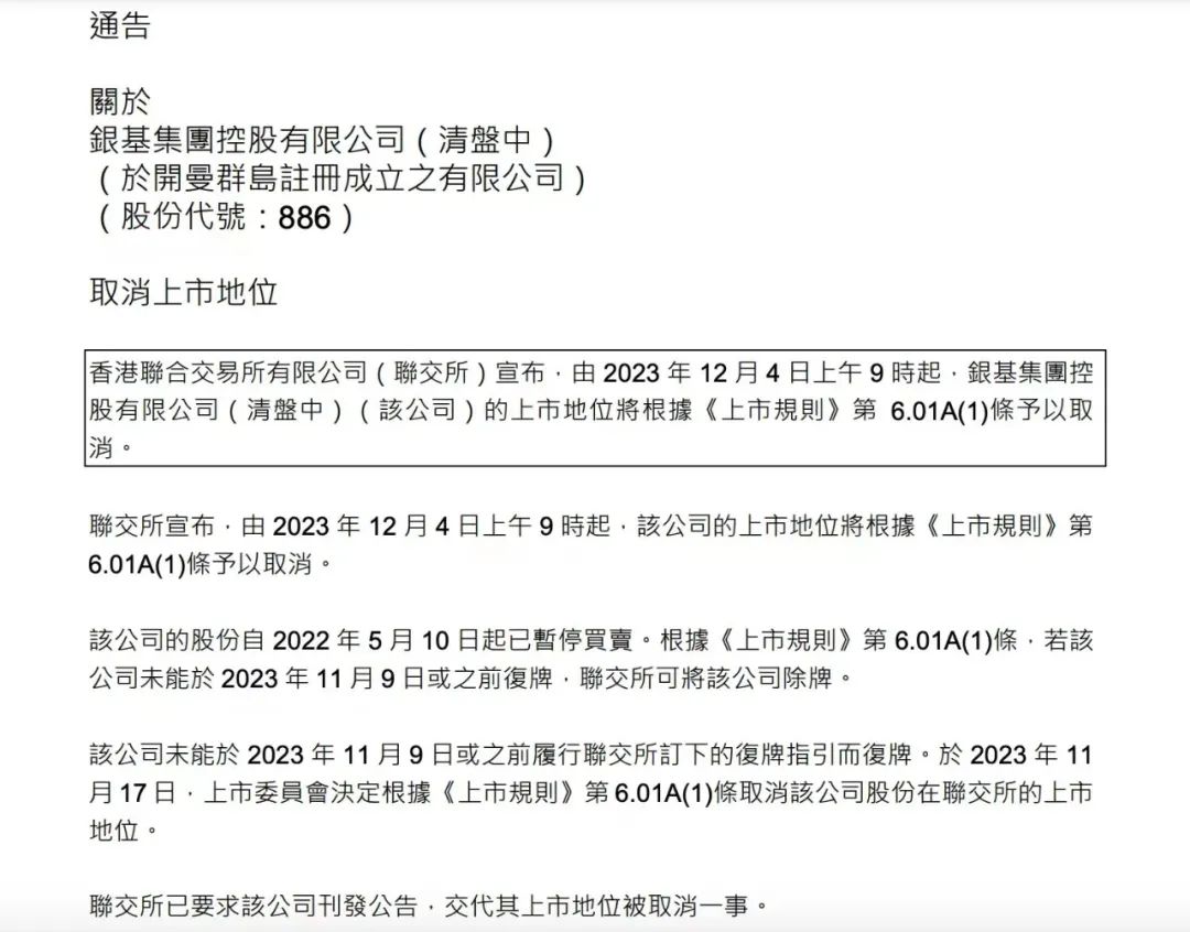 11月29日,高档酒类营运商银基集团控股有限公司(以下简称银基)发布公告称,12月4日9时起,银基集团的上市地位将被取消。