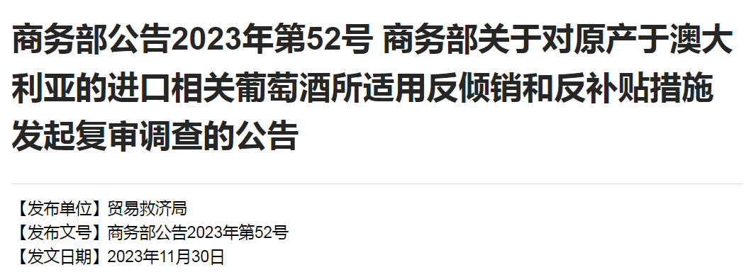 2023年11月10日,商务部就收到复审申请事宜通知了中国国内葡萄酒产业和澳大利亚驻华使馆,并向其转交了申请书。规定时间内,商务部未收到评论意见。