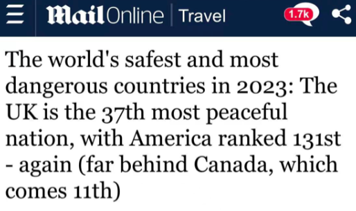 报告还指出:“北美地区只有两个国家,加拿大[第11位]的安全程度度上升了2.9%,而美国的和平度略有退步,总体得分下降了0.38%。两国之间的安定程度存在相当大的差距。”为何两国之间的差距如此之大?报告显示,原因之一是加拿大人的安全感:“只有不到 20% 的加拿大人表示,他们在夜间独自在城市或社区行走时感到不安全。”而美国排名较低的原因之一是谋杀率,报告指出:“美国的凶杀率总体增幅排名第四,目前每 10 万人中有 6 起凶杀案以上,比大多数西欧国家高出六倍多。”