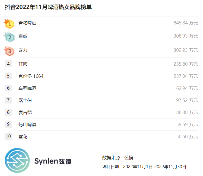 根据电商数据搜索工具——“弦镜”数据显示,抖音平台2022年11月啤酒热卖品牌榜单,第一名青岛啤酒,销售额为845.84万元。第二名百威,销售额为308.93万元。第三名喜力,销售额为302.23万元。从第四名到第十名分别为轩博、克伦堡 1664、乌苏啤酒、嘉士伯、麦古德、崂山啤酒、雪花。