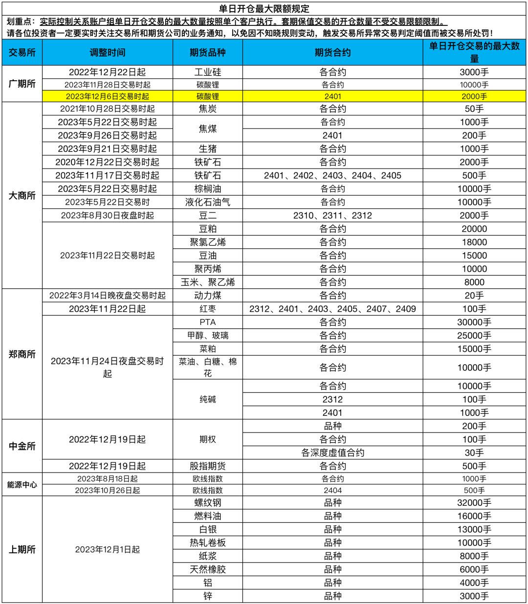 自2023年12月6日交易时起,非期货公司会员或者客户在碳酸锂期货LC2401合约上单日开仓量不得超过2,000手。该单日开仓量是指非期货公司会员或者客户当日在单个合约上的买开仓数量与卖开仓数量之和。套期保值交易、做市交易的单日开仓数量不受上述标准限制。具有实际控制关系的账户按照一个账户管理。