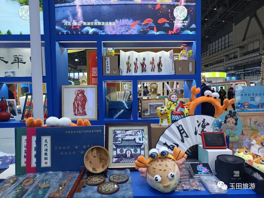 ▲玉田泥塑、剪纸、玫瑰花茶和木板烙画等特色文化和旅游产品亮相展位。