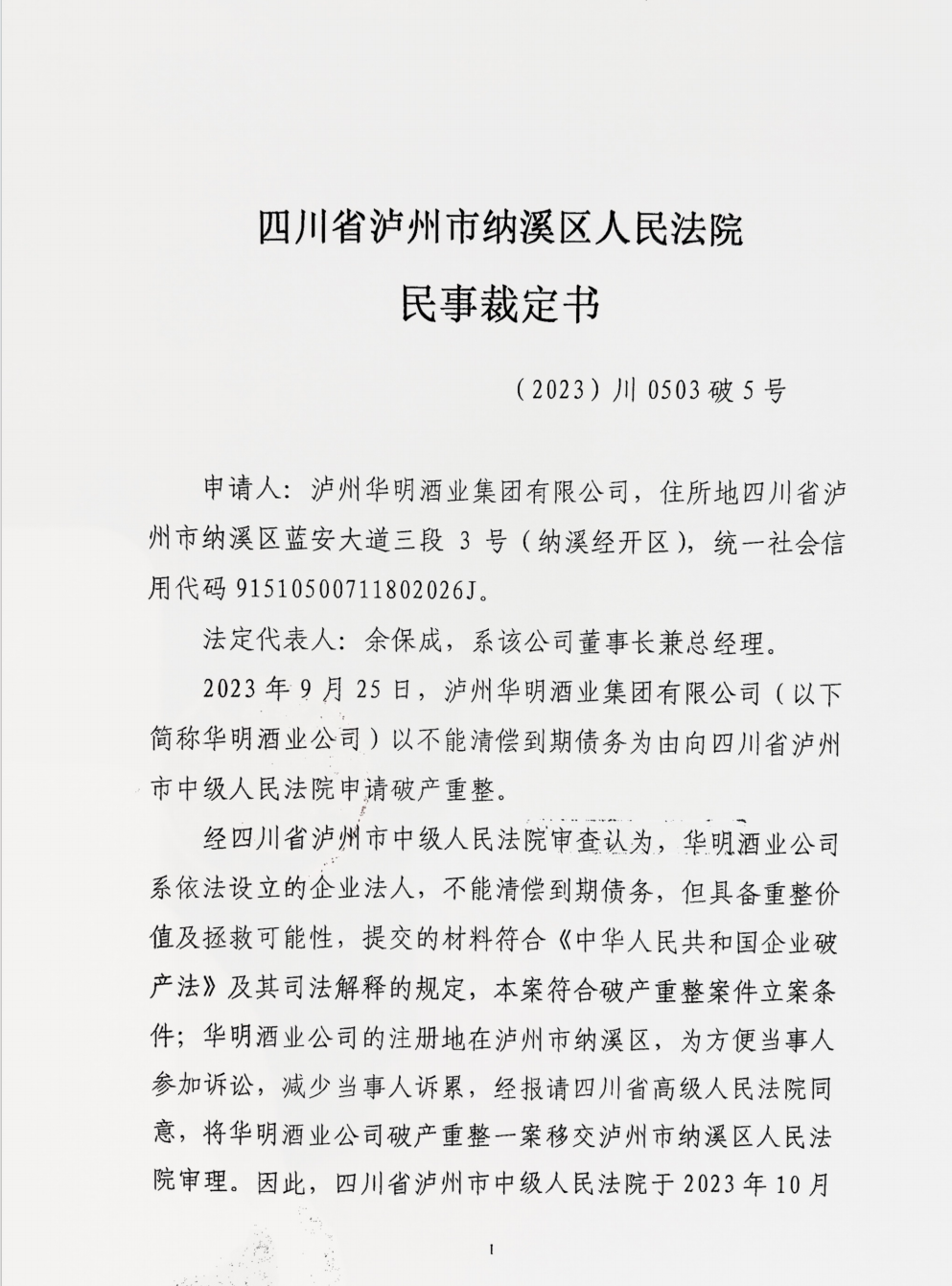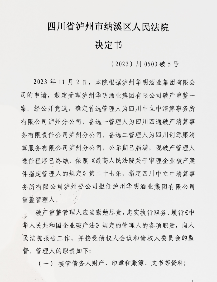 2023年11月2日,泸州市纳溪区人民法院作出(2023)川0503破5号民事裁定书,裁定受理泸州华明酒业集团有限公司(以下简称:“华明酒业”)的破产重整申请,并于2023年12月1日作出(2023)川0503破5号决定书指定四川中立中清算事务所有限公司泸州分公司担任泸州华明酒业集团有限公司管理人。 2023年12月5日上午,管理人负责人鲁政主持召开了管理人进场交接会议,管理人组成成员及华明酒业的核心成员顺利完成了进场交接工作。 会上,债务人负责人余静介绍了华明酒业公司管理团队成员以及公司的基本情况,管理人负责人鲁政讲解了管理人进场后的工作内容和计划。债务人负责人余静表示将积极履责,积极配合重整工作,争取破产重整成功。 会后,管理人与债务人相关人员一同前往公司厂区进行现场走访,了解公司的生产经营情况。