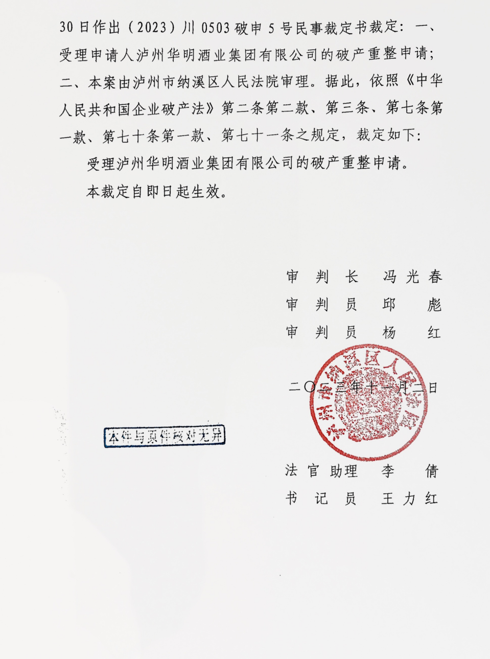 工作动态:泸州华明酒业破产重整管理人今日进场进场交接工作