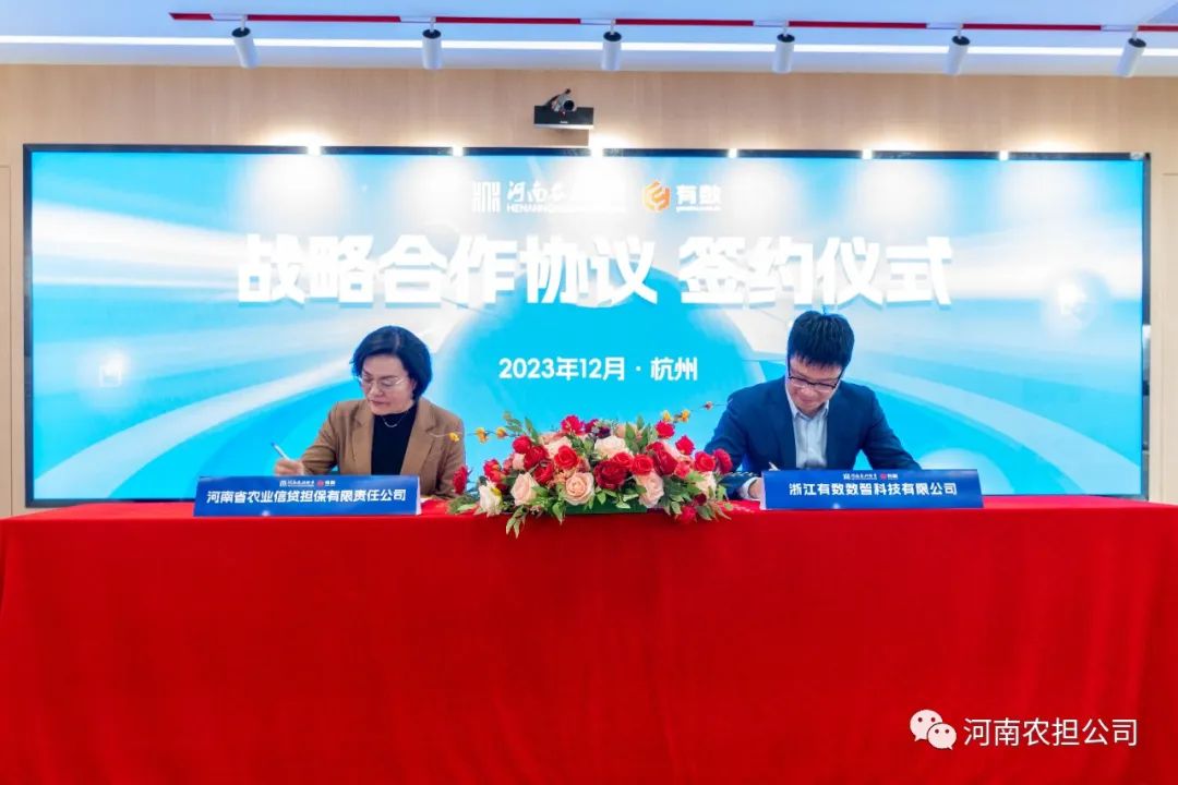 近日,河南省农业信贷担保有限责任公司(以下简称“河南农担公司”)与浙江有数数智科技有限公司(以下简称“有数科技”)达成深度战略合作。此次签约,标志着双方在三年业务合作基础上的全新战略升级,是双方秉承共同理念、促进共同发展、奔赴共同愿景,朝着更高目标、更全领域、更深层次合作的积极探索和实际行动。双方将进一步发挥各自在农业、金融、数据、数治等领域优势,共同推进企业信用评价体系、新型农业经营主体画像、企业差异化风控模型等建设。