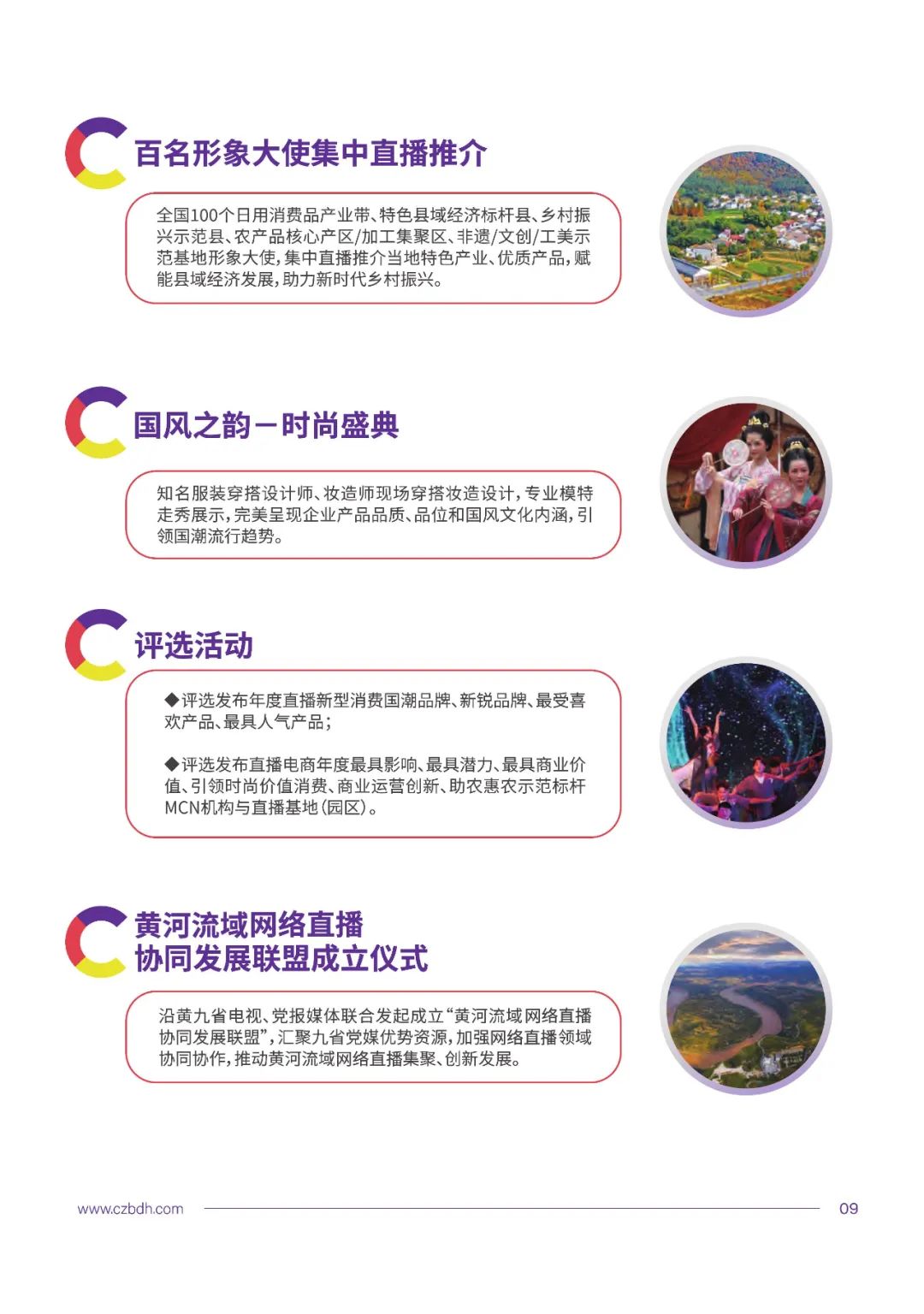 100多场高峰论坛、100多场直播选品供需合作洽谈对接会、上百名县长直播助力乡村振兴、国风之韵—时尚盛典、金C奖颁奖盛典—巅峰之夜/盛大表演。