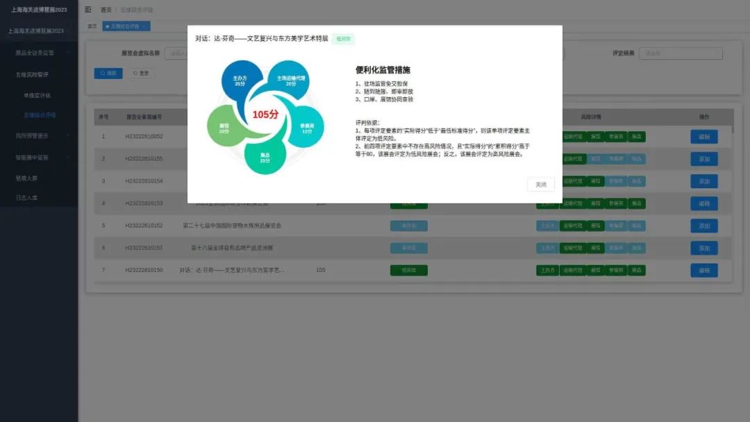 12月10日,阵容空前的“对话达芬奇—文艺复兴与东方美学艺术特展”即将在上海举办。接到主办方上海博物馆提交的免担保申请后,上海海关关员启动“智能小花”,开展风险测评。测评结果显示,该展览为低风险展会,得分105分,适用驻场监管免交担保、随到随报、即审即放和口岸、展馆协同查验等便利化监管措施。海关关员随即按照系统提示,予以相应的通关便利。截至日前,上海海关已对139个展会开展了风险测评,实现“一展一策”精准管理;为各类低风险展会提供口岸、展馆协同查验等个性化便利服务,使其整体通关时长平均缩短50%;一键生成风险预警清单,辅助规定期限内,高效完成回运、留购、销毁等后续处置,结案率100%。在海关监管服务和正向引导下,企业通关更便利,管理更规范,诚信经营、良性竞争的营商氛围已在上海会展业中悄然成型。启于进博,驶向未来,海关监管“智能航空母舰”已开足马力。随着上海会展业日益成熟壮大,上海海关将持续强化科技赋能,确保全过程精准监管,提供全渠道高效服务,为提升上海会展全球资源配置能力,增强全球影响力和国际竞争力保驾护航。