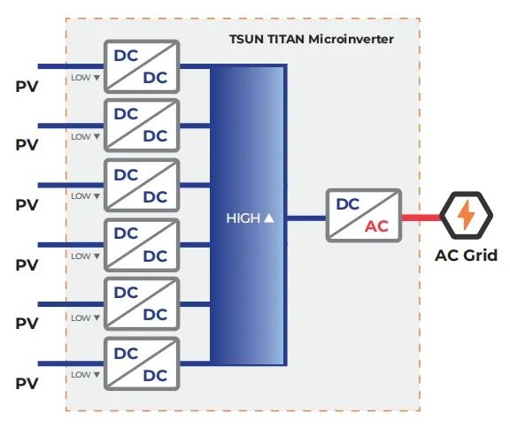 TITAN系列采用跨时代拓扑结构,相比传统优化器,系统外部低压,最大直流电压60V,无需配备RSD,AFCI,DC Box等,最大直流电压60V,无高直流电压威胁;相比传统微型逆变器,内部高压,系统发电效率更高。