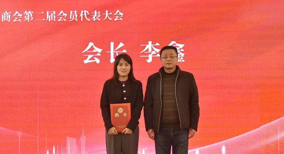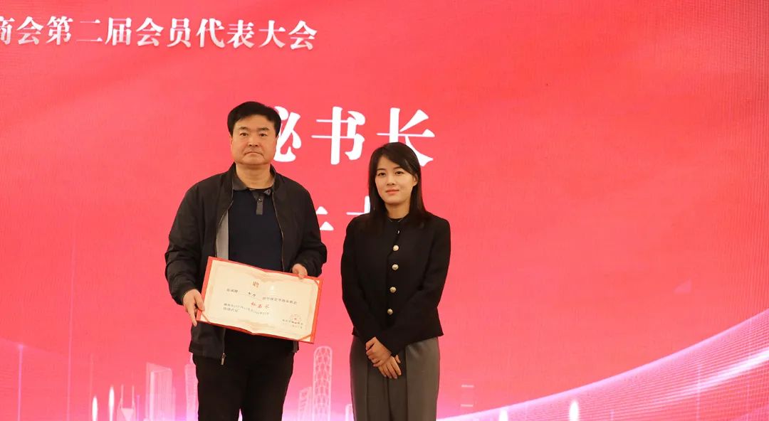 ▲保定市工商联(总商会)副主席王丽华为李宏涛颁发“终身名誉会长”聘书