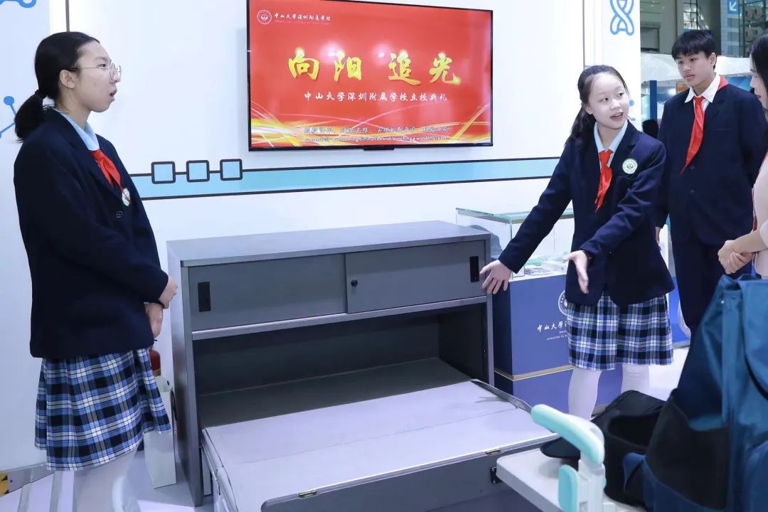 现场展示中山大学深圳附属学校“十六个一”健康工程:“一把电动牙刷、一个防脊柱侧弯的书包、一个防近视支撑架、一盏护眼灯、一张午休床……”等物品,充分体现学校关注儿童健康成长,把学生健康放在第一位的核心理念。