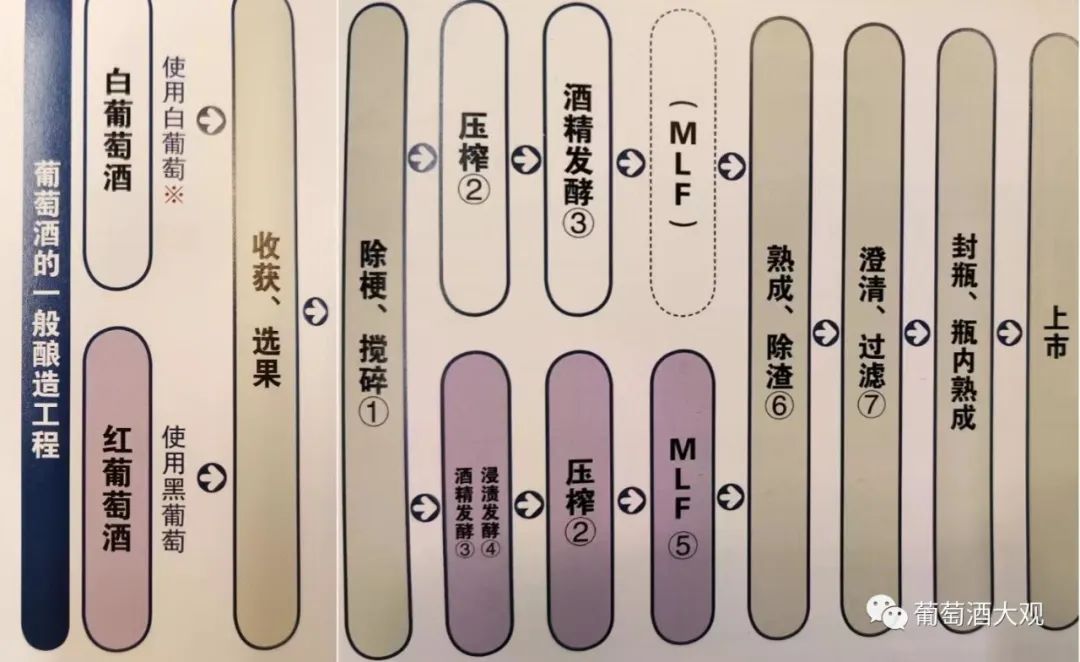 关于白葡萄酒和红葡萄酒,白葡萄酒基本使用白葡萄,而红葡萄酒基本使用黑葡萄。这是由于红葡萄酒的色素来自于黑葡萄皮。同样,酿造方面的巨大区别在于红葡萄酒提取果皮和籽上的色素和成分,使其沁入果汁之中,这一过程称之为“浸渍发酵”。由此造成白葡萄酒的“压榨”过程在发酵前进行,而红葡萄酒在发酵后进行。