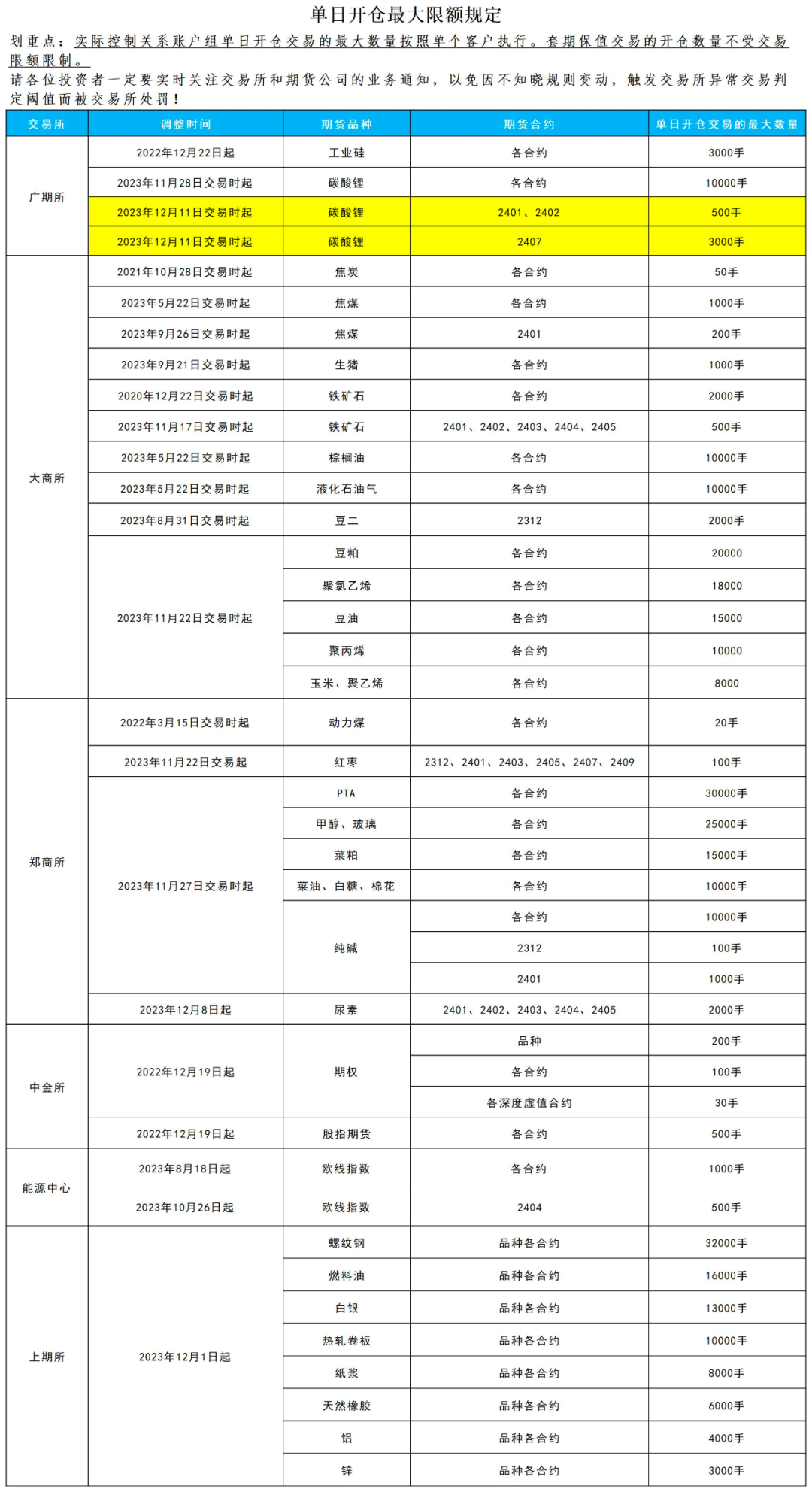 关于调整碳酸锂期货部分合约涨跌停板幅度、交易保证金标准、交易手续费标准和交易限额的通知接广州期货交易所(广期所发〔2023〕286号)通知,调整碳酸锂期货部分合约的涨跌停板幅度、交易保证金标准、交易手续费标准和交易限额。经公司研究决定,自2023年12月8日结算时起,碳酸锂期货合约涨跌停板幅度调整为10%,交易保证金标准调整为17%;其中,碳酸锂期货LC2401合约、LC2402合约交易保证金标准调整为20%。自2023年12月11日交易时起,碳酸锂期货LC2401合约、LC2402合约的交易手续费标准调整为成交金额的万分之十九点二,日内平今仓交易手续费标准调整为成交金额的万分之十九点二。碳酸锂期货LC2403、LC2404、LC2405、LC2406、LC2407、LC2408、LC2409、LC2410、LC2411合约的交易手续费标准调整为成交金额的万分之四点八,日内平今仓交易手续费标准调整为成交金额的万分之四点八。自2023年12月11日交易时起,在碳酸锂期货LC2401合约、LC2402合约上单日开仓量不得超过500手,碳酸锂期货LC2407合约上单日开仓量不得超过3,000手。该单日开仓量是指当日在单个合约上的买开仓数量与卖开仓数量之和。套期保值交易、做市交易的单日开仓数量不受上述标准限制。具有实际控制关系的账户按照一个账户管理。如遇上述涨跌停板幅度、交易保证金标准与现行执行的涨跌停板幅度、交易保证金标准不同时,则按两者中幅度大、标准高的执行。已与我司约定按交易所加收固定比例或绝对值收取手续费的客户,保持同步调整。具体手续费标准请登录快期V2进行查询。广期所将根据市场情况对涨跌停板幅度、交易保证金标准、交易手续费标准和交易限额进行调整。请各位投资者关注结算账单,做好资金管理,注意持仓风险,谨慎操作,理性投资。交易所将采取有效措施,加强市场监管,抑制交易过热,打击违法违规交易行为,保障市场平稳运行。如有疑问,请咨询客户经理、所属分支机构或公司客服热线400-801-1058。
