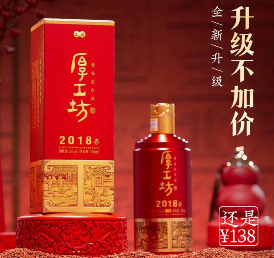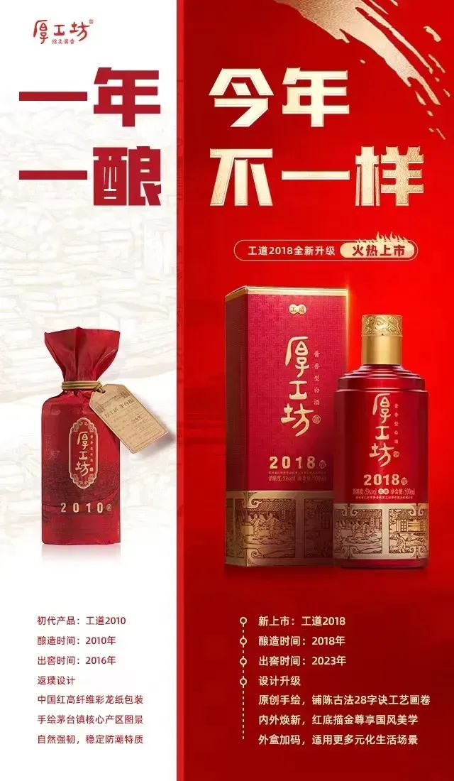 2023年,厚工坊推出工道2018,对外包装进行全新升级,在坚守原有价格基础上实现了加码不加价,使得厚工坊以半光瓶的优势在光瓶市场上占据一席之地,也在百元酱酒的“围剿赛”中强势突围。