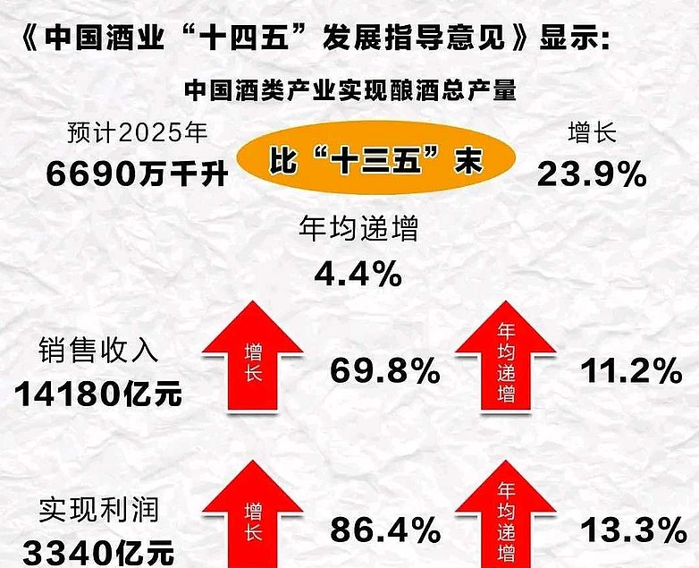 根据《中国酒业“十四五”发展指导意见》预计,2025年白酒行业产量6690万升,比“十三五”末增长23.9%,实现利润3340亿元。