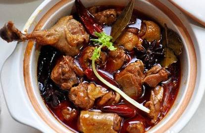 3.起砂锅将鸭子放进去,加入花雕酒及所有调料盖锅慢火炖煮(如果调料无法淹盖鸭子请先将鸭子背朝上焖一段时间后再翻面炖)至鸭肉酥烂