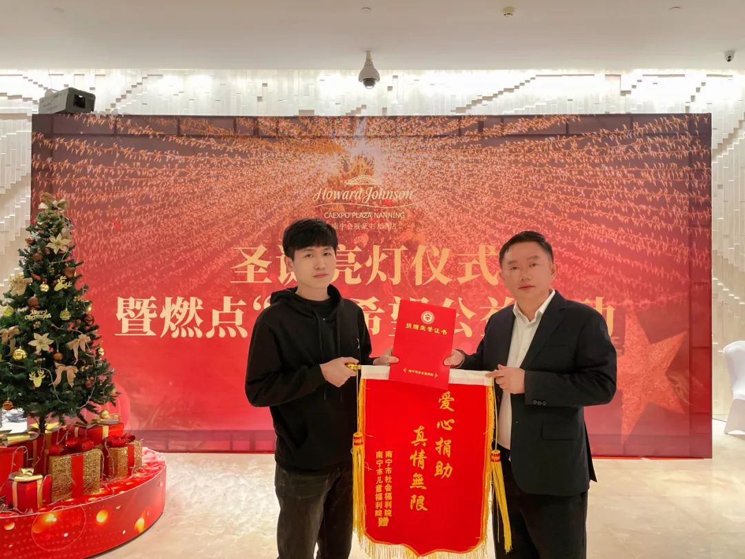 酒店积极履行企业社会责任,在本次亮灯仪式前,全体员工发起了公益献爱心捐赠活动,公司主要负责人代表酒店全体员工上台献上爱心捐款。南宁市社会福利院派出代表上台接受爱心捐赠并赠予酒店锦旗。