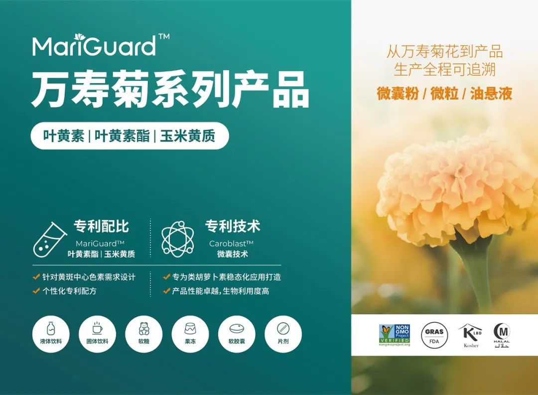 MariGuard™万寿菊系列产品包含叶黄素、叶黄素酯、玉米黄质三大种类,从鲜花到产品全产业链可追溯,完善的质量管理体系保障产品的天然安全,目前产品剂型包含油悬液、微囊粉、微粒三种,基本可覆盖后端应用全部剂型需求。