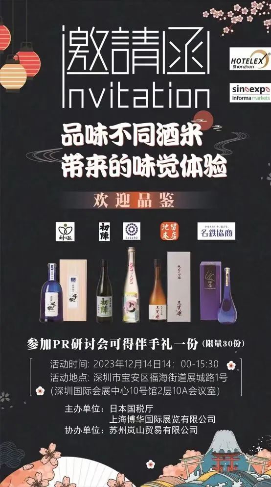 本次展会上,由上海博华国际展览有限公司联合日本国税厅主办,苏州岚山贸易有限公司协办的品味不同酒米带来的味觉体验-日本国税厅清酒分享会即将开办,将为大家带来五款清酒知识讲解及品鉴。