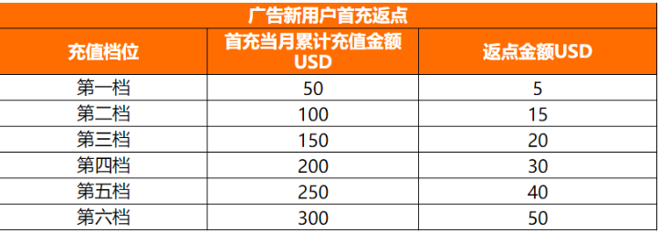 2023年12月1日之前从未进行广告充值的店铺在活动期间 (2023年12月1日 - 2023年12月31日),在各个渠道进行广告充值且当月充值累计达任意档位要求,则可获得对应档位奖励,奖励以广告金的形式于下月初发放至账户中。