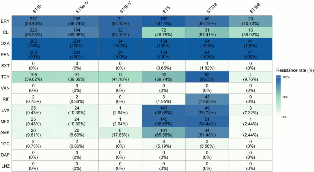 中国金黄色葡萄球菌耐药变化趋势如图3所示。MRSA的分离率呈现缓慢下降趋势,从2013年的35.7%逐步下降至2021年的29.4%,不同地区的MRSA分离率也有所差别。CA-MRSA(社区获得性MRSA)传统上仅限于医院以外的健康人群,是其与HA-MRSA(医院获得性MRSA)区分的基础,然而近年CA-MRSA和HA-MRSA之间的定义开始逐渐模糊,CA-MRSA逐渐在医疗环境中站稳脚跟,包括中国在内的多个国家,更易感的毒力更强CA-MRSA克隆逐渐取代了多重耐药HA-MRSA克隆。在中国,毒力更强的ST59已经取代了ST239成为MRSA的优势克隆[5]。表1显示了中国不同MRSA分子型别的药物敏感性[6]。