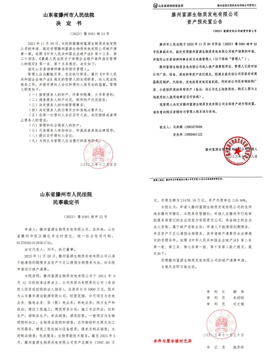 滕州市人民法院于2023年11月30日作出(2023)鲁0481破申32号民事裁定书,裁定受理滕州富源生物质发电有限公司破产清算的申请,并指定山东真谛律师事务所为本案管理人(以下简称“管理人”)。