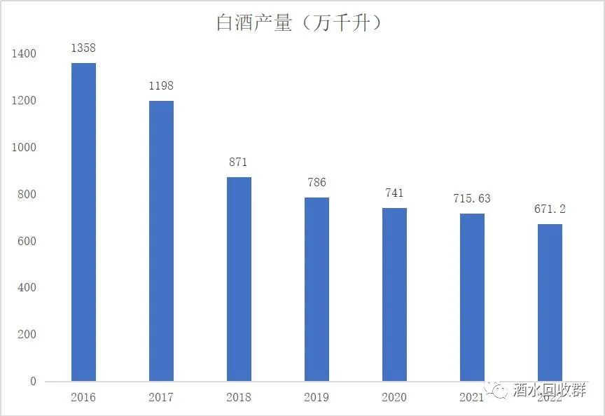 根据统计数据显示,国内白酒产量在2016年达到了最高峰,达到了1358万千升。然而,在接下来的几年里,白酒产量持续下降,到2022年已经降至671.2万千升。白酒产量的下降速度比消费量更快,否则就不会出现经销商和代理商库存积压过多的情况了。