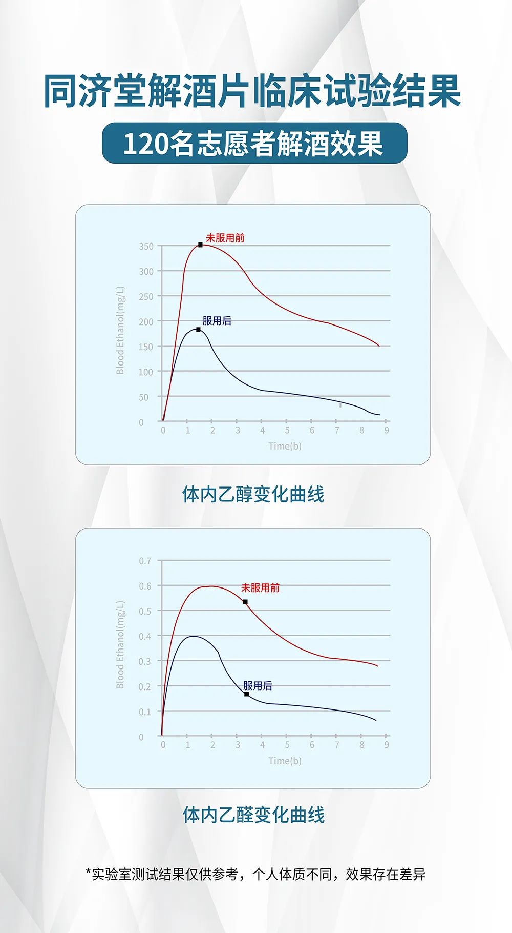效果有多好?同济堂找了120名志愿者临床测验,在喝酒前服用2粒解酒片,分别测试乙醇、乙醛的含量。