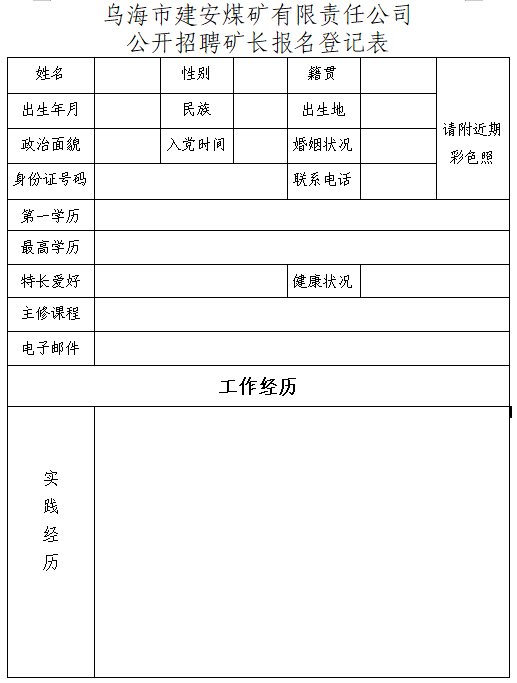 乌海市建安煤矿有限责任公司成立于2007年,注册资本金1.7亿元,是一家集露天煤矿生产,煤炭销售的企业。公司现有露天煤矿可采面积1.02 km2,生产能力90万吨/年。因工作需要,现面向社会公开招聘煤矿矿长1名。(1)品行端正,遵纪守法,忠诚企业,身体健康,吃苦耐劳,能够长期驻外工作,具有良好的心理素质;具有强烈的事业心、责任心和良好的团队精神;(2)熟悉现代煤炭企业管理,了解煤炭产业相关法律政策和煤炭企业运作特点,掌握国家安全生产方针、政策、法规规章,掌握地方及有关部门制定的矿山安全生产规定和规程;(3)具备矿山安全管理知识,具有较高的安全生产管理水平和丰富的安全生产管理经验,具有很强的决策判断、生产经营管理、组织协调、改革创新、处理复杂问题和突发事件能力;(4)熟悉露天煤矿采矿生产工艺和技术,熟悉矿山的采掘、地质、水文、通风、灭火、供电等基本情况;(8)持有关部门签发的《安全生产知识和管理能力考试合格证》;(9)具有国有煤矿企业或私有中小型煤矿企业“五职”矿长五年以上工作经验。1.受过司法机关刑事处罚的,处于党纪政纪处分期内的,涉嫌违纪违法正在接受有关机关审查尚未作出结论的;2.国家法律法规、党纪政纪和有关政策规定不能担任企业领导人员职务的;3.由于个人原因,导致企业出现重大安全生产事故,或造成企业资产严重流失和重大经济损失的,个人在企业安全生产、经营管理活动中有弄虚作假记录的。报名采取线上报名的方式,有意向者,可发送《乌海市建安煤矿有限责任公司公开招聘矿长报名登记表》(附件)到邮箱13947102169@139.com。1.报名人员接到公司通知后,携带以下材料到公司办公楼进行现场资格审查。联系人:刘先生,联系电话:13947102169。公司对拟聘人员进行背景调查,调查结果属实后,拟聘人员与公司签订《劳动合同书》,试任矿长职务,试任期为三个月。试任期满考核合格后,公司正式聘任。人员录用后,工资标准按乌海市建安煤矿有限责任公司矿长薪酬待遇执行。