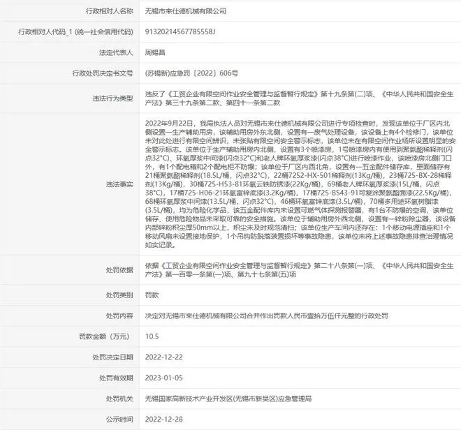 12月22日,无锡国家高新技术产业开发区(无锡市新吴区)应急管理局作出(苏锡新)应急罚〔2022〕606号处罚决定书。无锡市新吴区应急管理局行政许可和行政处罚等信用信息公示专栏载明:无锡市来仕德机械有限公司因违反《工贸企业有限空间作业安全管理与监督暂行规定》第十九条第(二)项、《中华人民共和国安全生产法》第三十九条第二款、第四十一条第二款,处罚款10.5万元。