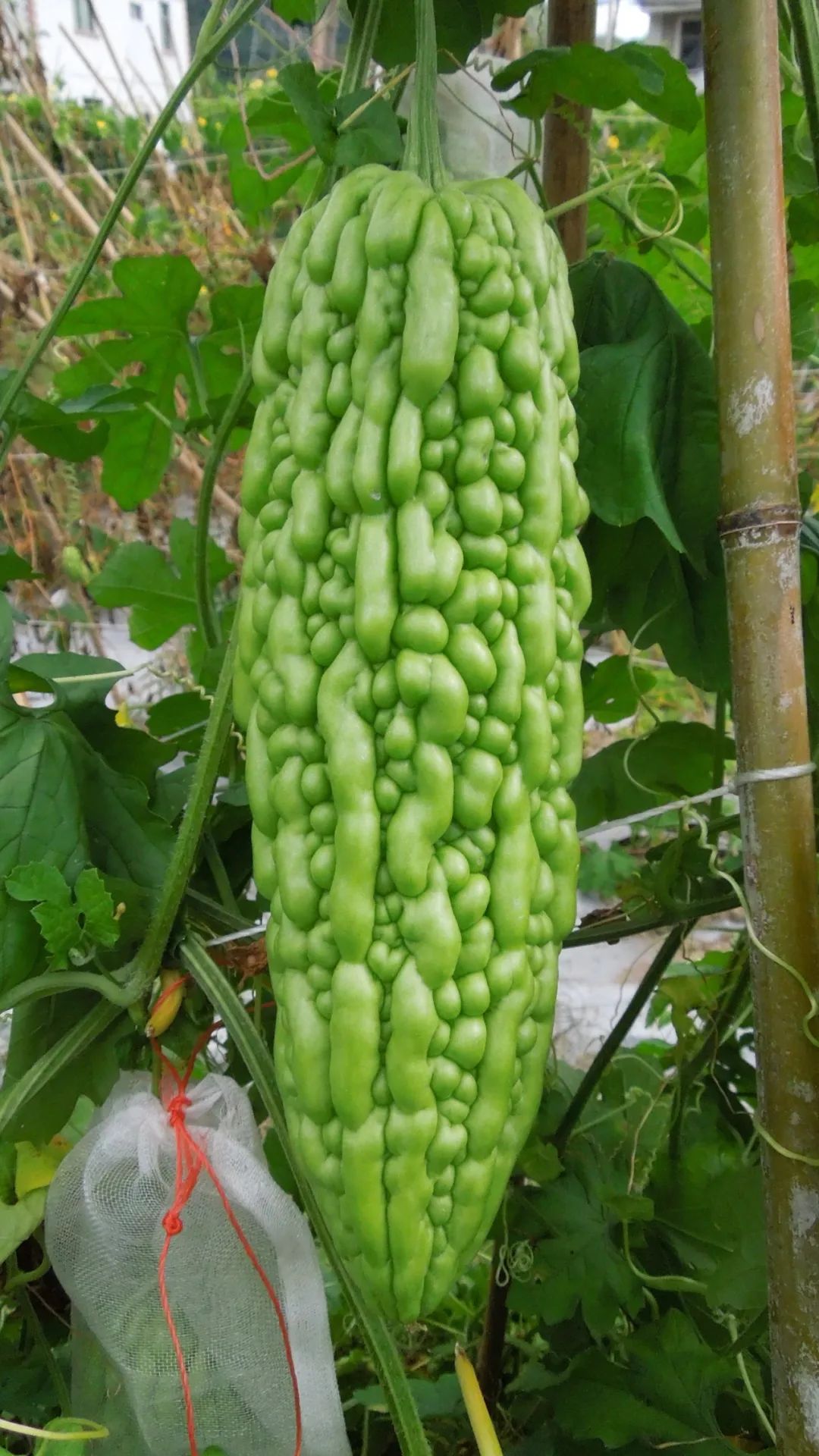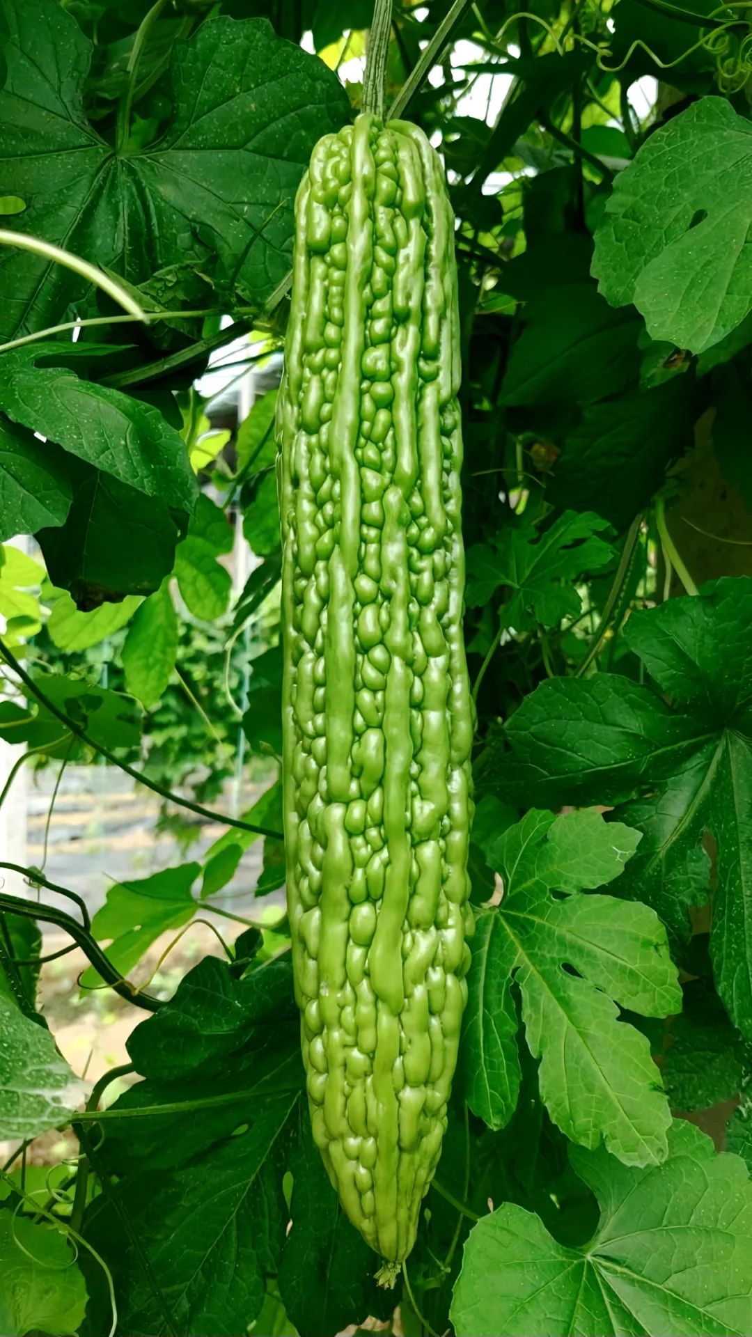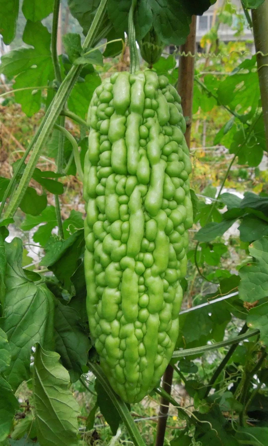 早生,植株生长势良好,主蔓和侧蔓均可座瓜,连续座果能力强,丰产性好。果实长圆锤形,果肩相对较平,尾部钝尖,瓜皮亮绿色,有光泽,果面有粒状瘤与长纵条瘤相间,外观优美,商品性佳。瓜长约35cm,横径约7cm,肉厚约1.0cm,单果重约600g。肉质脆嫩,苦味适中,品质优良。