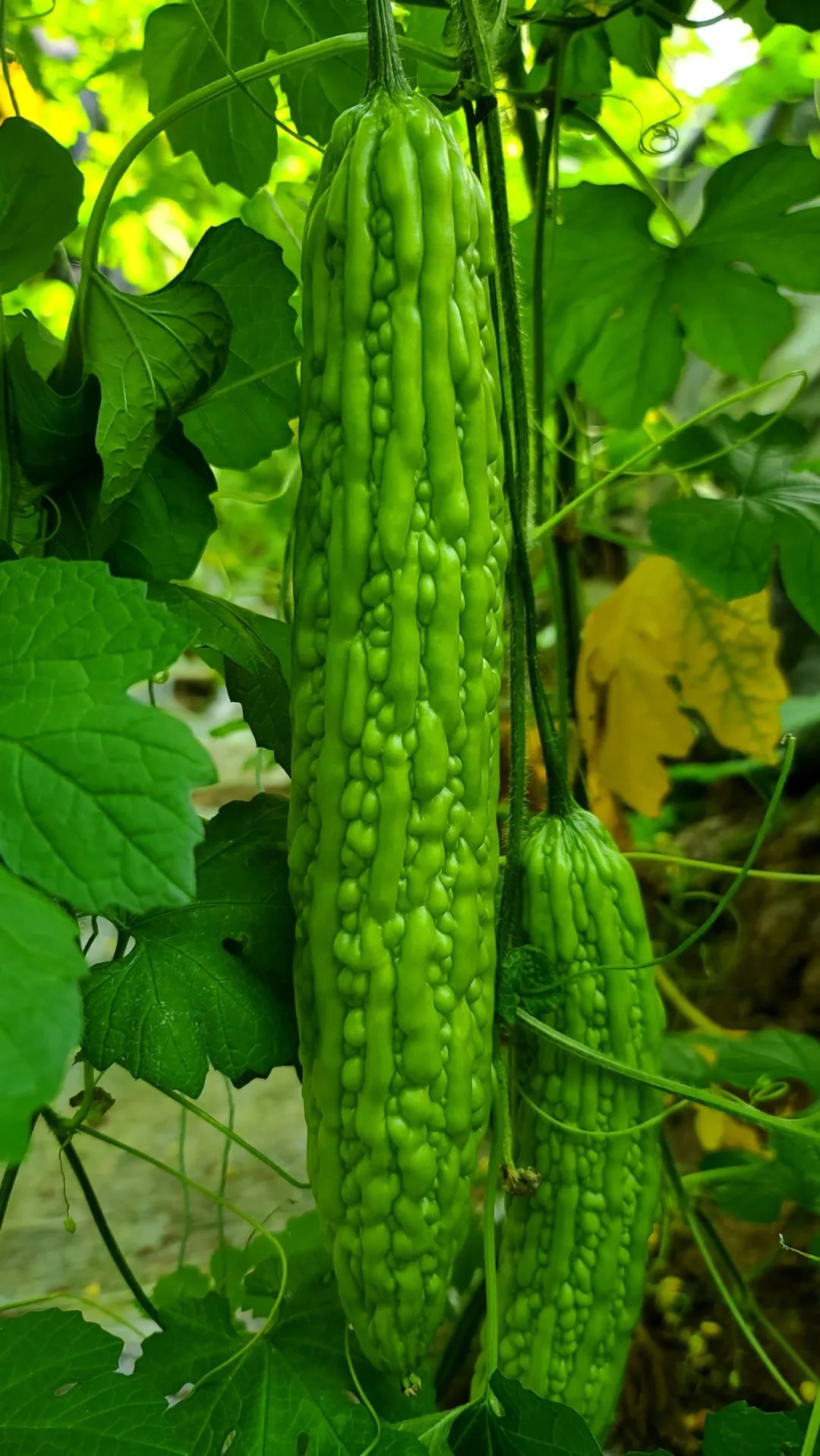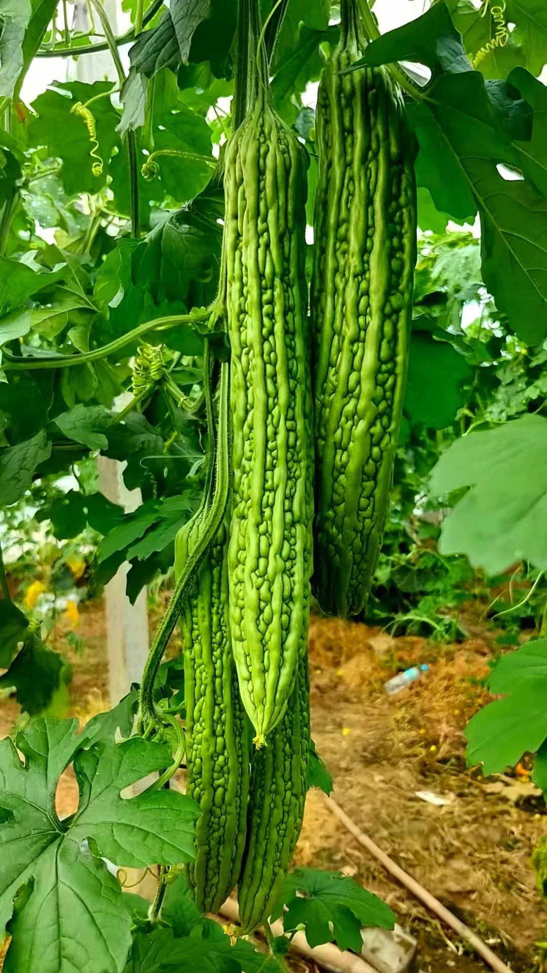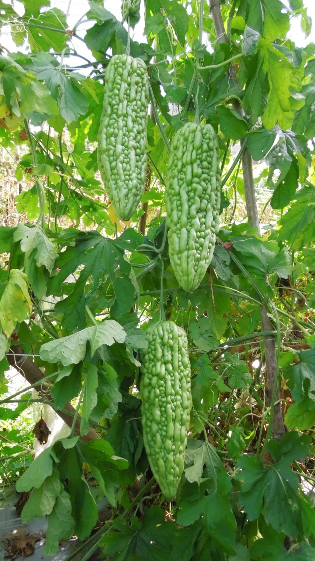 早生,植株生长势良好,主蔓和侧蔓均可座瓜,连续座果能力强,丰产性好。果实长圆锤形,果肩相对较平,尾部钝尖,瓜皮亮绿色,有光泽,果面有粒状瘤与长纵条瘤相间,外观优美,商品性佳。瓜长约35cm,横径约7cm,肉厚约1.0cm,单果重约600g。肉质脆嫩,苦味适中,品质优良。