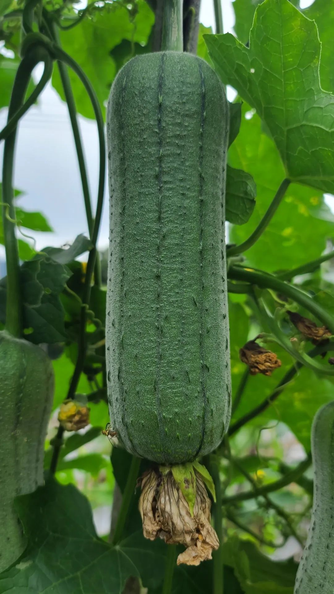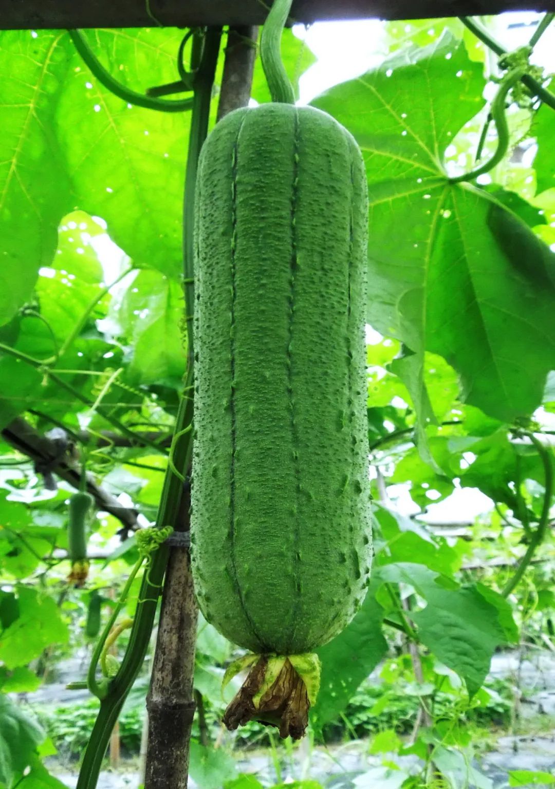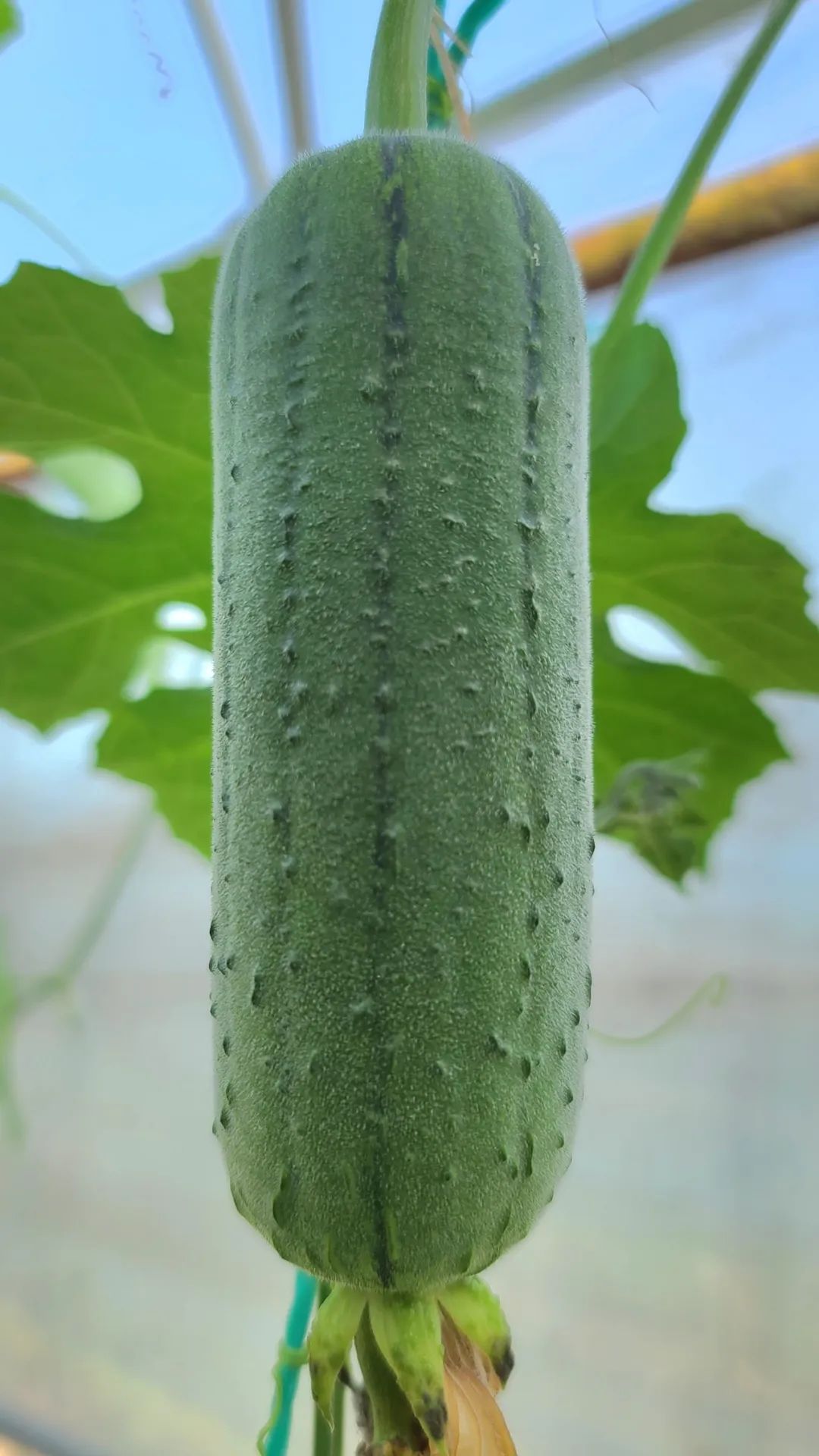 早中生,植株生长势强健,连续结果能力强,采收期长,丰产性好。瓜条圆筒形,瓜皮翠绿色,条纹明显,表皮中等粗糙,外观优美,商品性佳。长度约25cm,横径约8.0cm。适合采收时,单瓜重约700g。瓜肉致密,不易褐变,味清甜,口感好,品质优良。