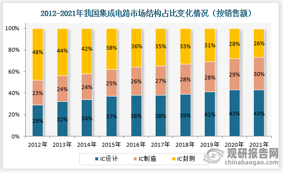 由于我国集成电路起步晚且行业主流产品加工技术比国外落后,创新开发能力弱,设计、工艺、设备、材料、应用、市场的开发能力均不十分理想,相关人才欠缺,因此过去国内多数组装型企业扮演着为国外集成电路厂商打工的角色,行业市场则主要是以IC封装测试为主。近些年来,随着行业政策资本的助力,技术水平得到提升等,IC设计和制造市场份额也随之扩大。根据数据显示,2012年到2021年,我国IC设计市场占比从29%增长至43%;IC制造市场占比从23%扩大至30%;而封装测试市场占比则是从48%下降至26%。由此可见我国集成电路行业市场发展重心是逐步由封装测试转向芯片设计转移。