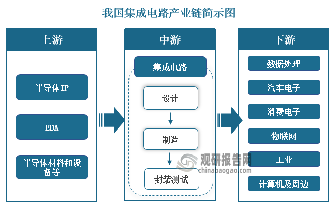 集成电路(integrated circuit)缩写为IC,是一种微型电子器件或部件,其是采用一定工艺将一块电路所需的晶体管、二极管、电阻、电容和电感等电子元器件制做在一块或几小块晶片或晶片上,然后通过封装成为一个整体。目前集成电路主要是指利用半导体材料制成的集成电路,指在一个半导体衬底上至少有一个电路块的集成电路装置。当代工业大多数应用的是基于硅的集成电路,也有少量的第三代半导体即半导体化合物制造的集成电路。因此集成电路产业链上游主要包括半导体IP、EDA和半导体材料和设备等;其中游则是集成电路的生产,可以大致分为IC设计、IC制造、IC封测三个主要环节,即集成电路设计公司根据客户需求设计出集成电路图,然后委托芯片制造厂根据设计的电路进行晶圆加工,再委托封装厂进行集成电路封装、测试;下游则是其终端应用,具体包括数据处理、汽车电子、消费电子、物联网等领域。